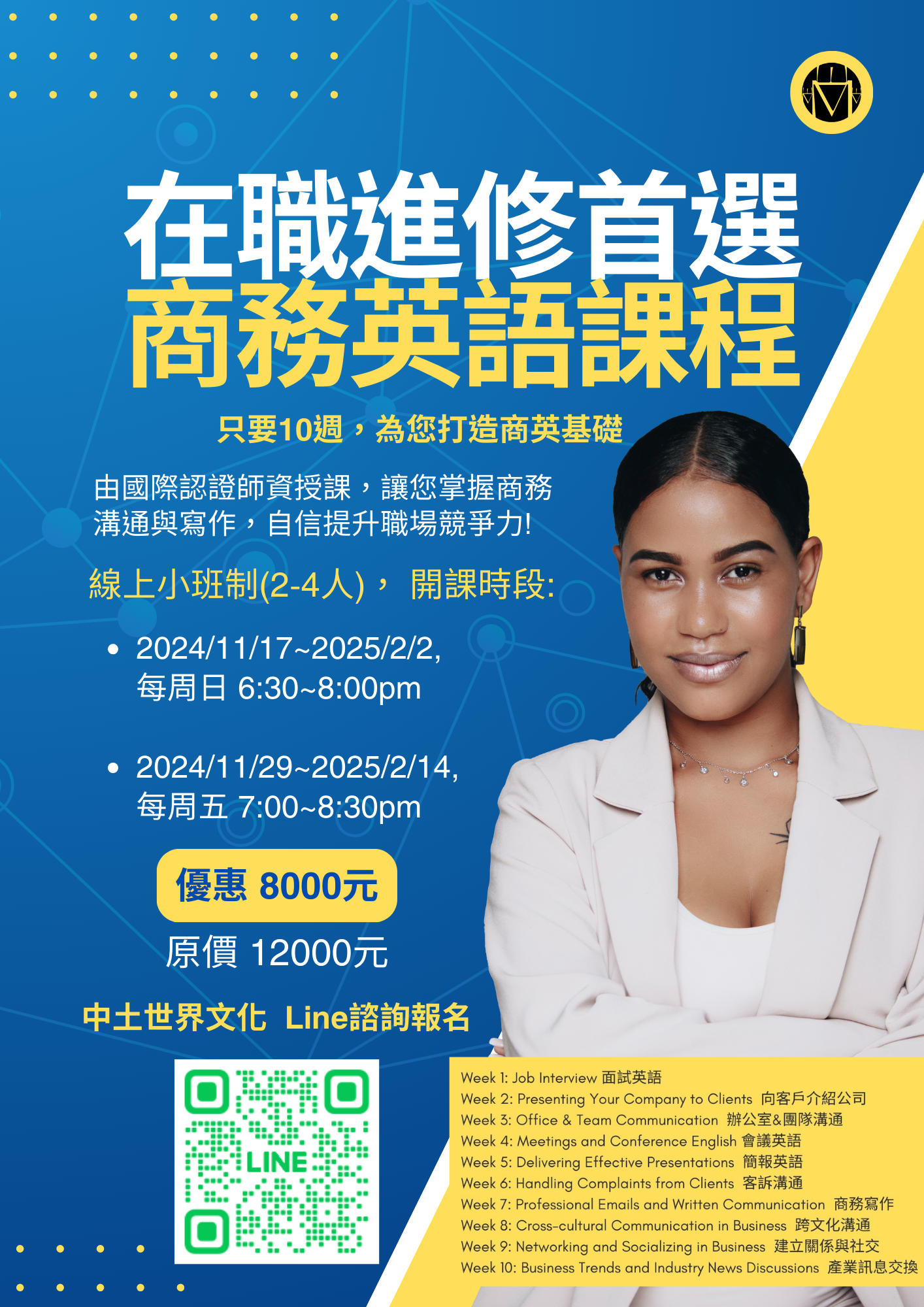 無論您是經理、企業家或剛步入職場的畢業生,我們的課程旨在幫助您從日常英語跨越到專業商務英語的層次。建議程度多益450分以上學員報名。