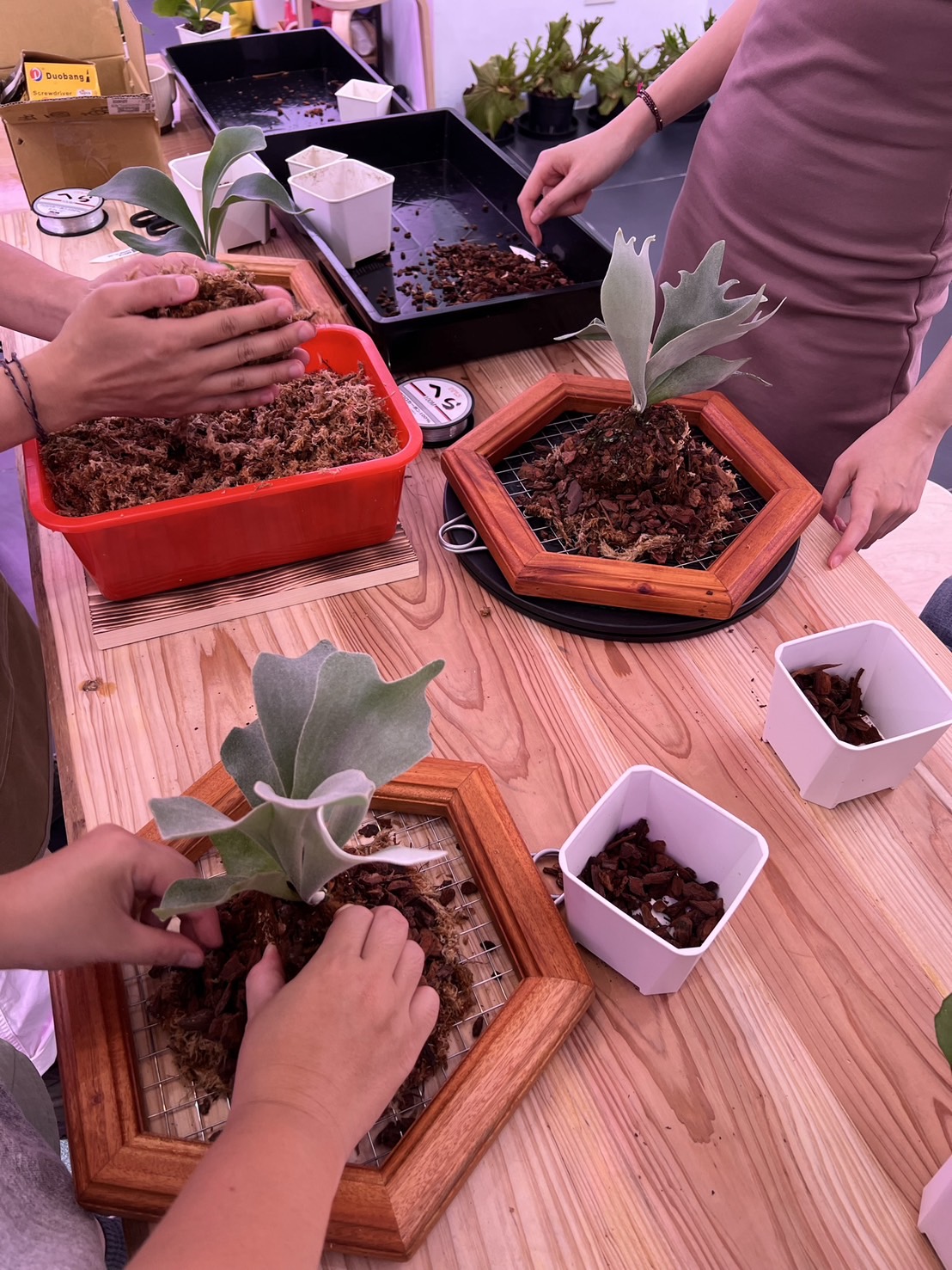 鹿角蕨講師拾荒鹿人手把手帶你完成鹿角蕨上板,初學者也可以輕鬆完成屬於自己的鹿角蕨植株。並帶入正念的應用,感受與植物連結的療癒時光。