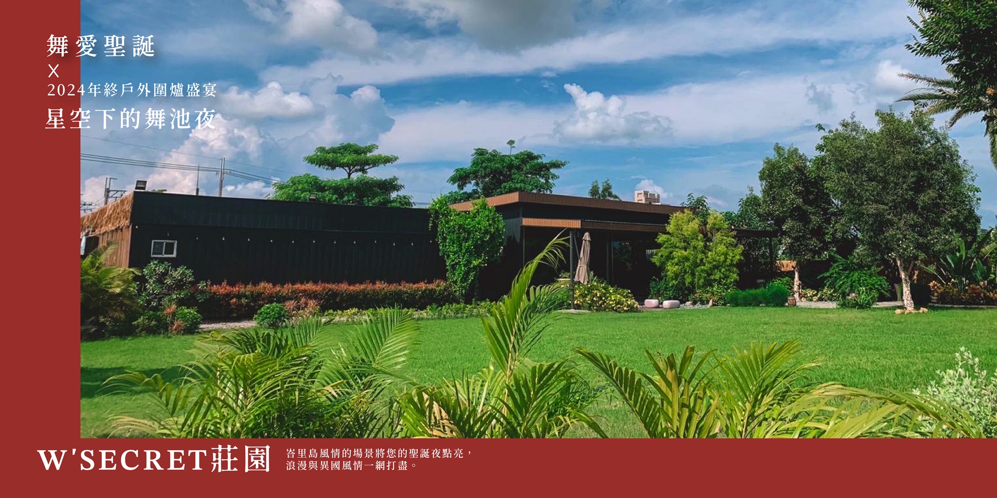 這個聖誕節,告別傳統的宴會形式,來到台南最夢幻的 W'SECRET 莊園,享受別具一格的浪漫體驗!我們將以峇里島風情的設計,為您打造出充滿異國情調的聖誕派對。搖曳的燭光、迷人的星光,映襯出熱帶風情的氛圍,讓您和賓客仿佛置身海外度假天堂。