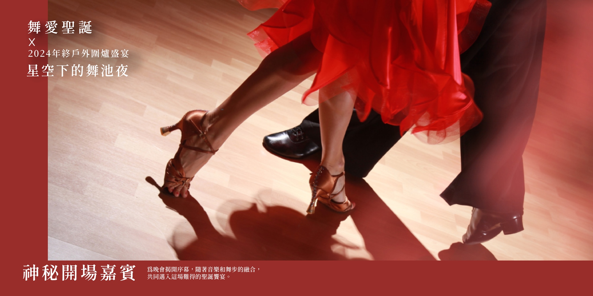 本次活動特別邀請到『神秘特別嘉賓』為晚會揭開序幕,隨著音樂和舞步的融合,共同邁入這場難得的聖誕饗宴。隨著音樂響起,燈光柔和地點亮舞池,這位神秘嘉賓將以華麗的舞步與熱情的旋律,引領全場進入聖誕奇幻世界。在他們優雅而充滿活力的舞蹈中,星光、節拍與異國情調交織,瞬間燃起派對的熱情。嘉賓們的每一步舞動彷彿引領著賓客共同穿越到夢幻的異國風情之中,為這場夜晚增添更多驚喜與難忘的瞬間。