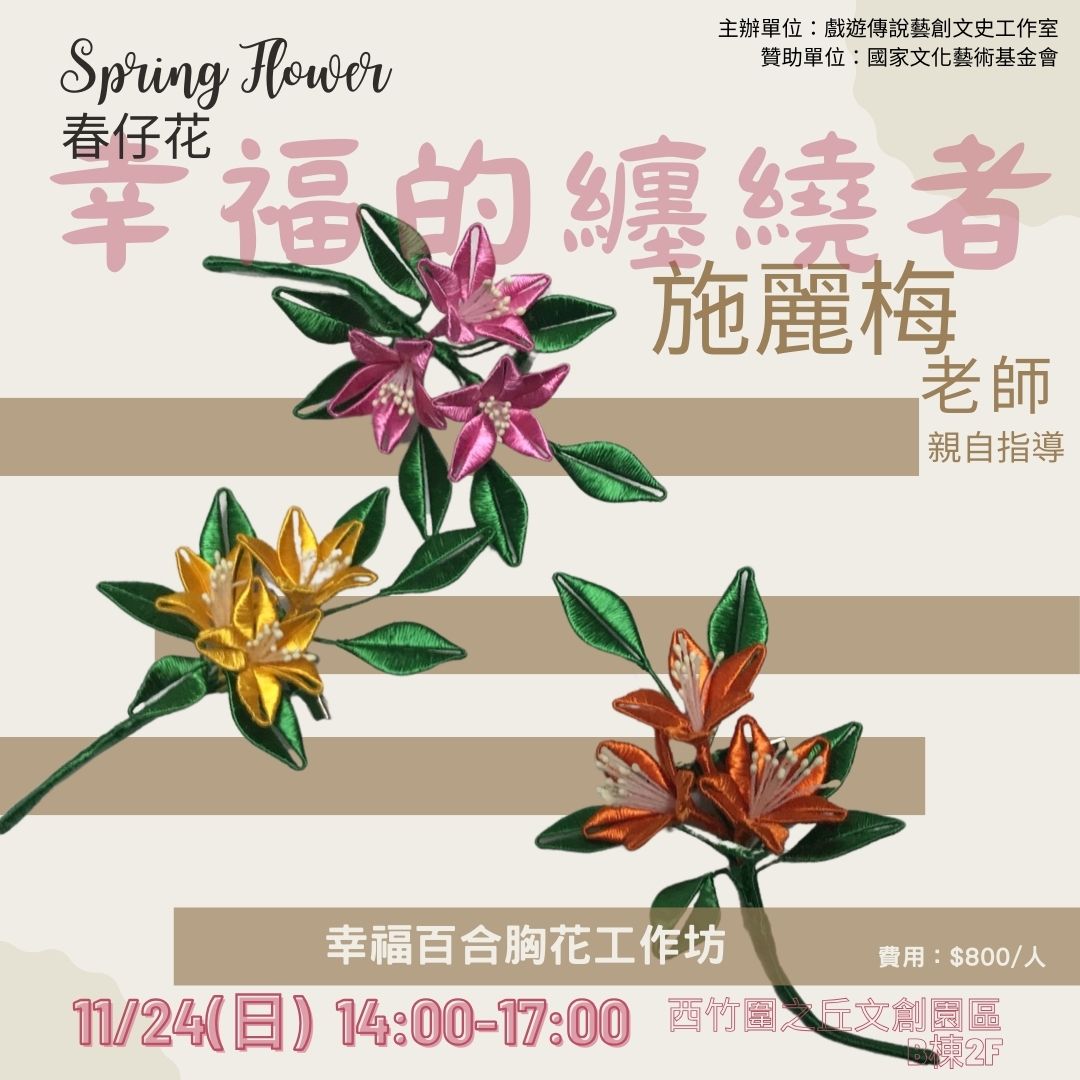 這一次的展覽,我們邀請到鹿港的施麗梅老師來親自帶領大家進行《幸福百合春仔花手作體驗》。