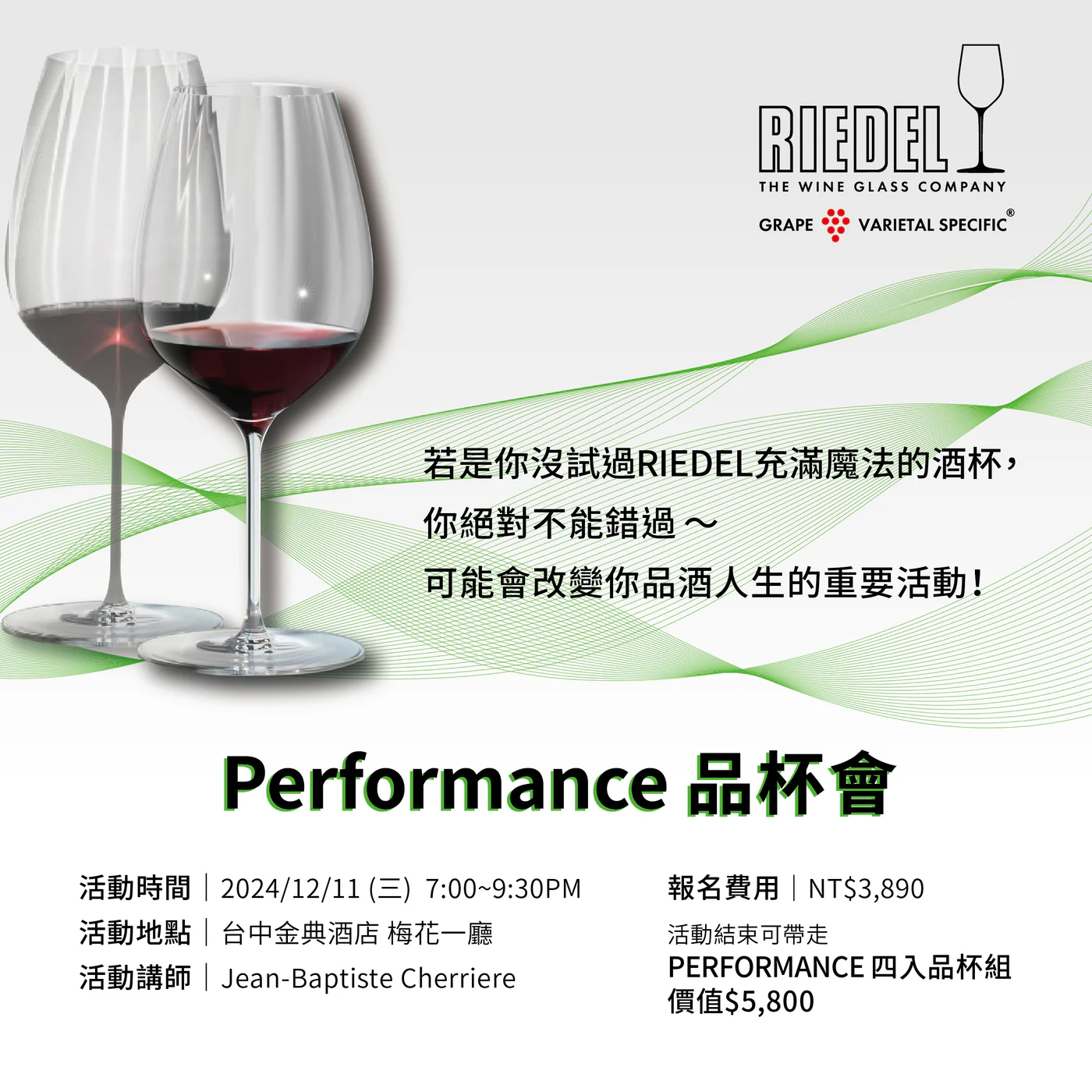 5.當日活動將於7:00PM開始,報名參加者最晚須於6:55M完成報到,超過7:00PM恕無法進場,報名費可兌換等值RIEDEL定價商品。