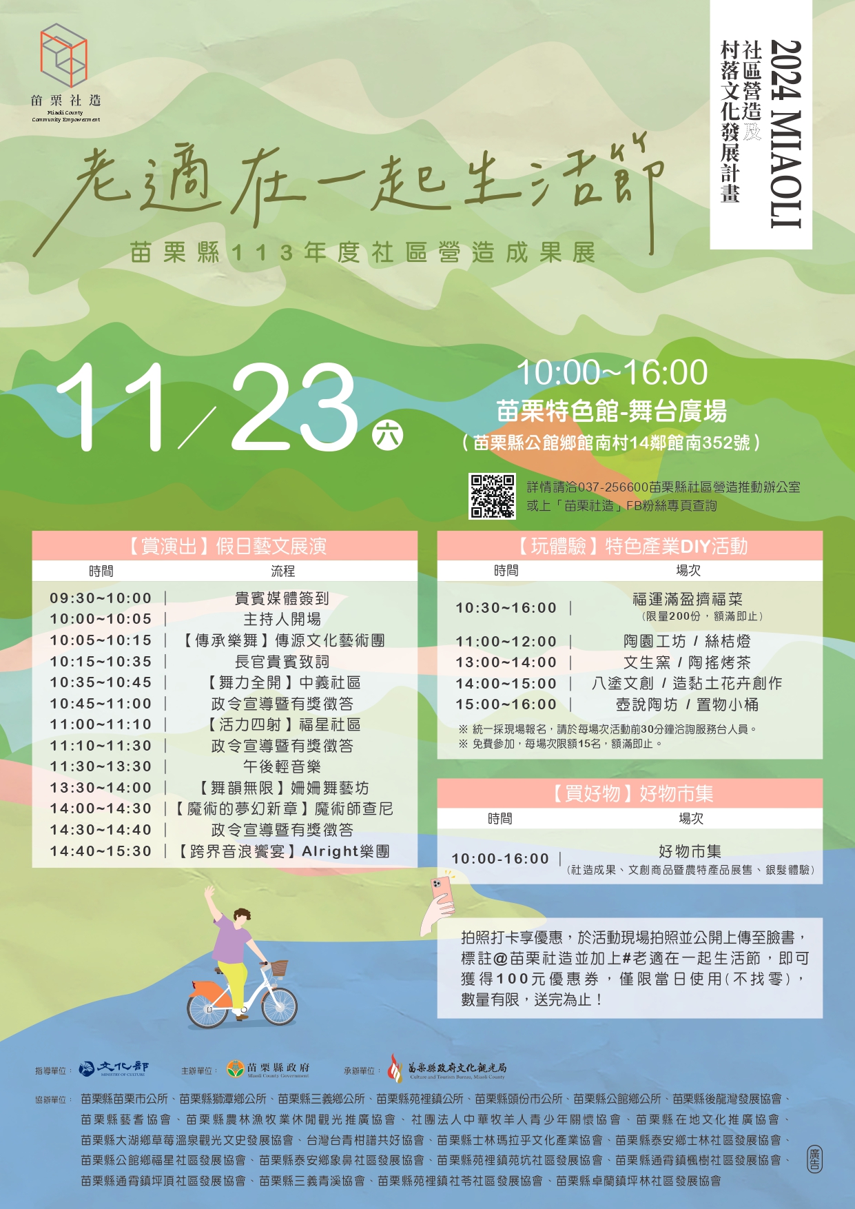 ✔ 「老適在一起生活節」是傳達的一個精神,旨在打造一個適合長者生活、青年返鄉的良好環境,感謝公所、社區、青年、產業等各界傑出人才的共同努力,為文化扎根付出心力,才能創造共榮共好的產業及居住品質,歡迎大家來共襄盛舉這場精彩的苗栗人文盛宴。