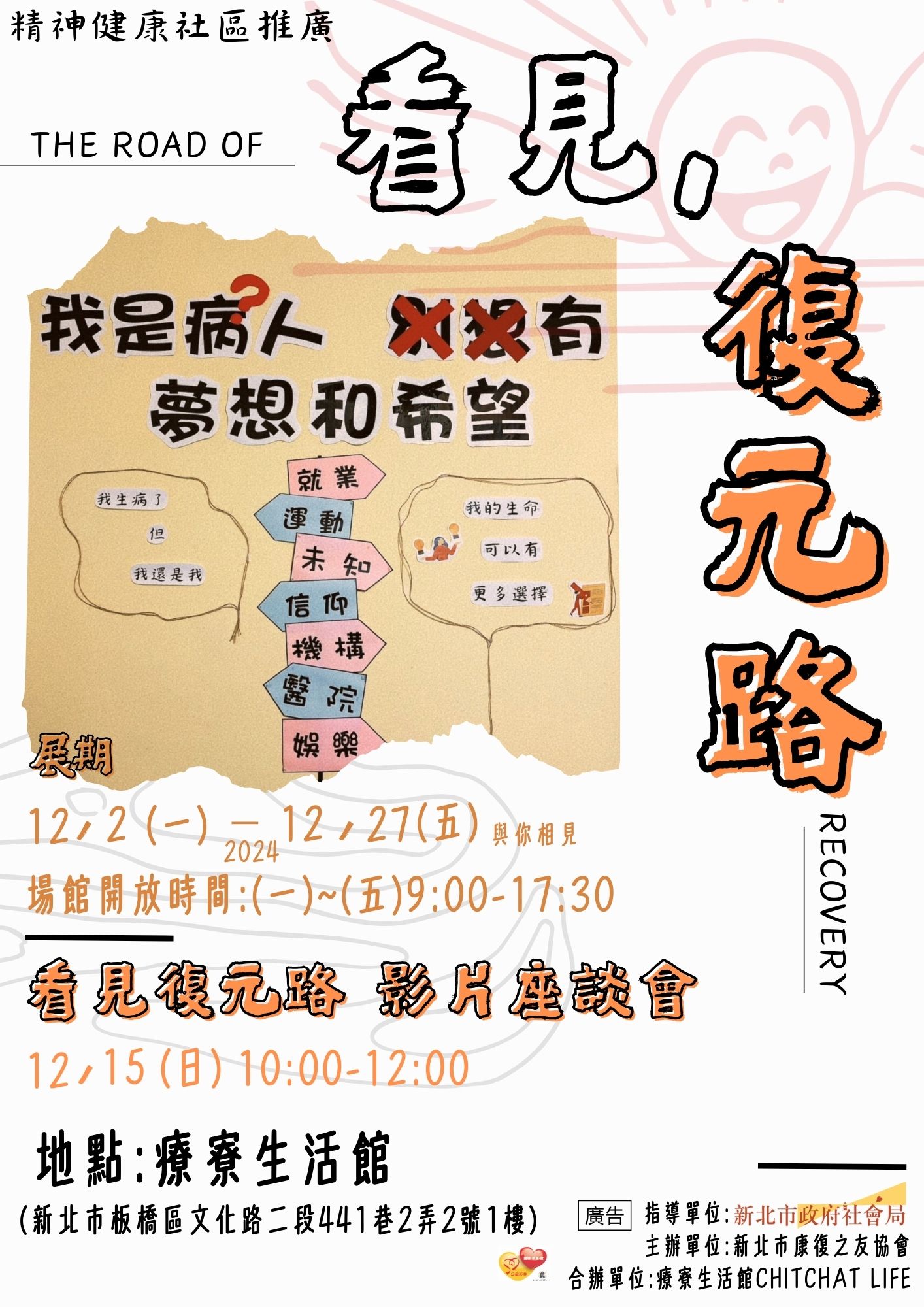 - 12月15日將有影片座談會,康復者將親自分享他們的復元故事,透過交流與互動,讓大眾更理解精神健康復元的重要性。
