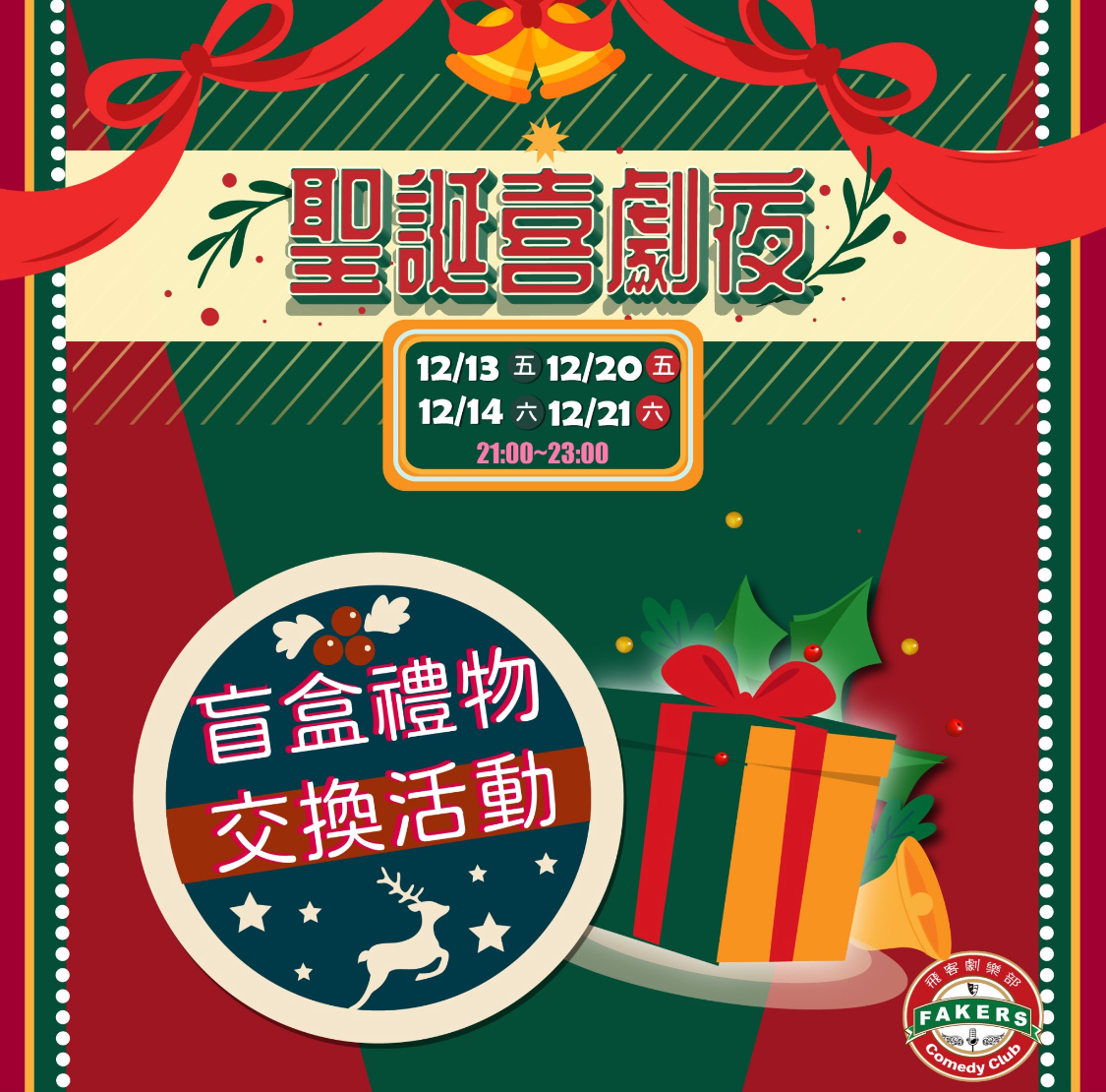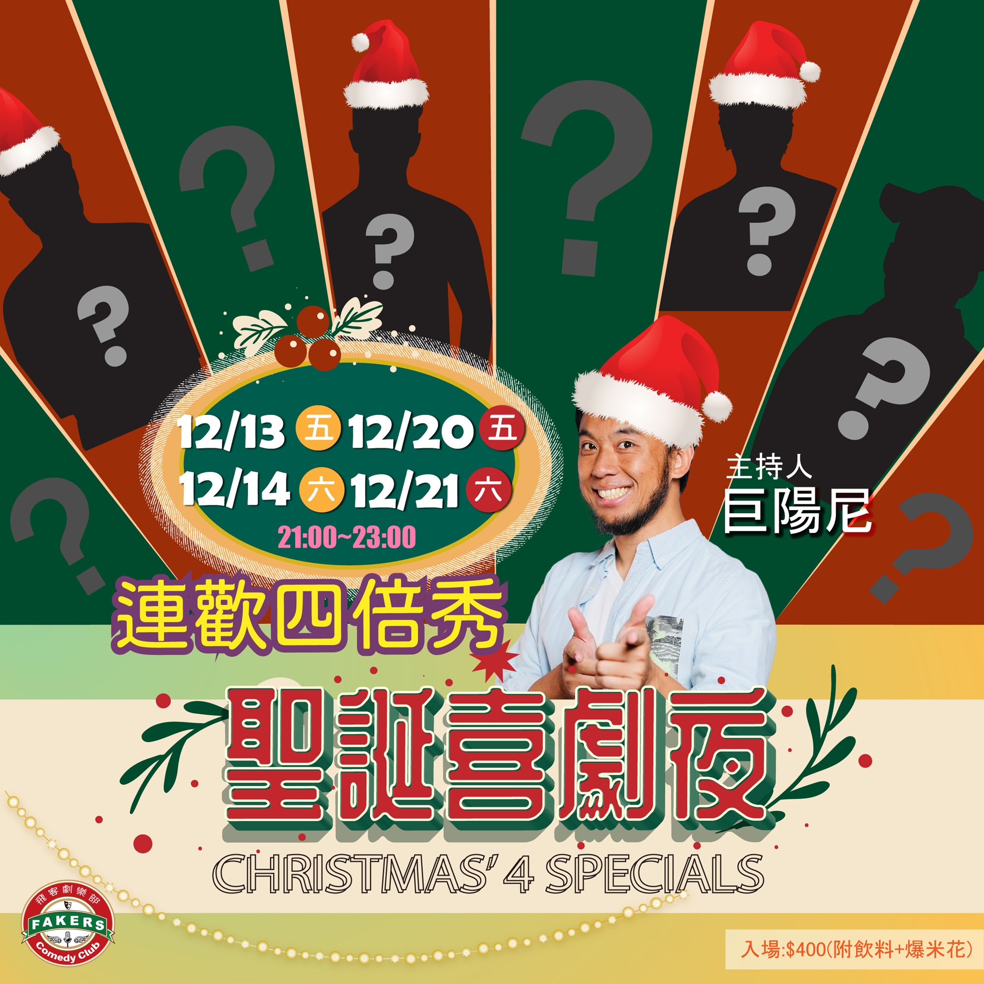 飛客俱樂部12月特別企劃:《聖誕喜劇夜—連歡四倍秀》為您邀請到一群熱愛脫口秀站立喜劇的演員們陪您度過今年的最後一個聖誕月~! 把握今年最後的機會,走過路過不要錯過 ~!