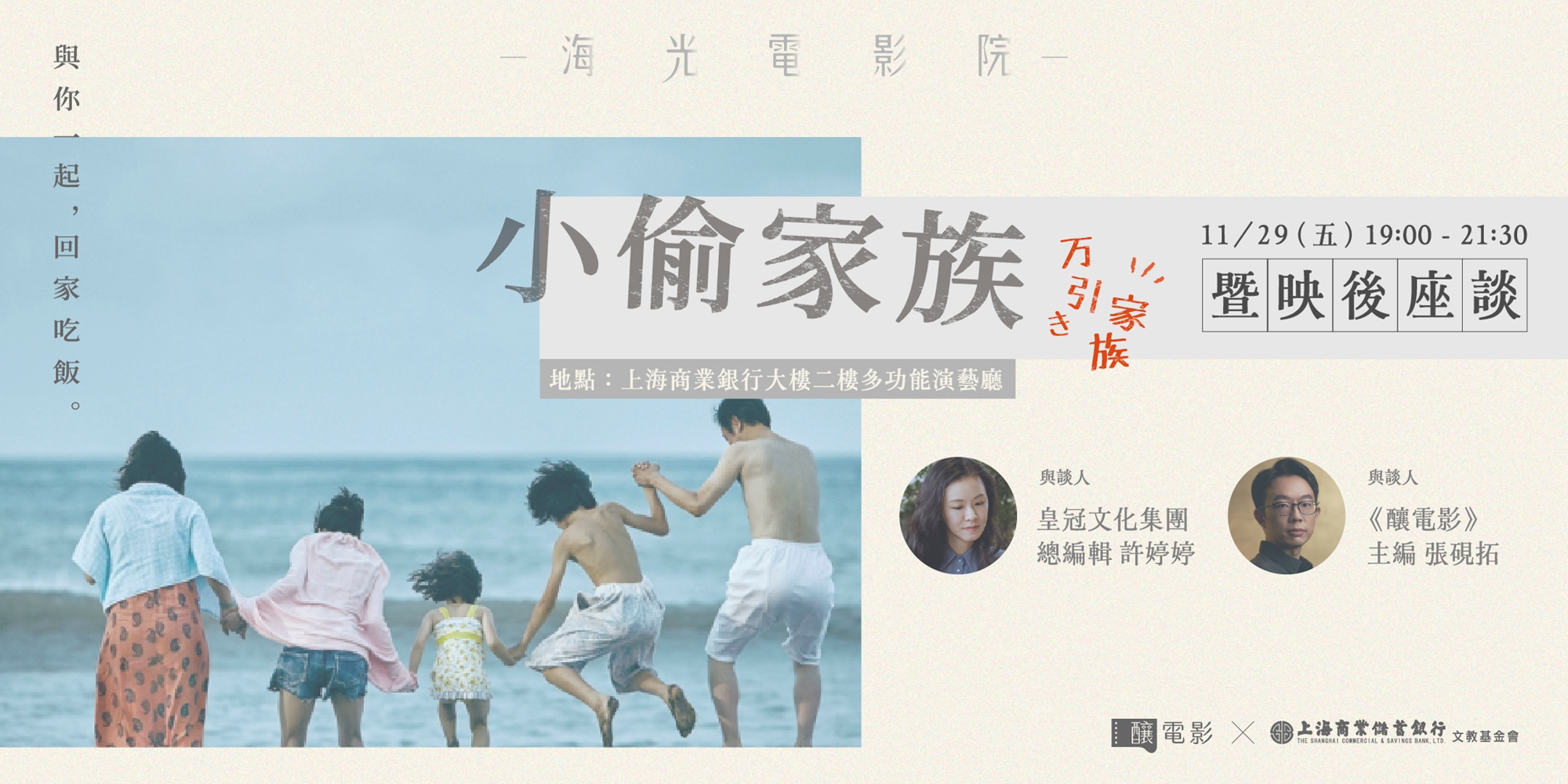 海光電影院第四彈,就讓我們一起在週五夜晚,再看一次《小偷家族》,再回味一次樹木希林的笑顏、安藤櫻的氣場,再對著炸可樂餅和咖哩烏龍麵流口水。當天映後,我們更邀到剛以 podcast 節目《給我一個故事的時間》奪下金鐘獎的皇冠文化總編輯許婷婷,一起來聊人情、聊遺憾、聊相互看顧的心,還有在別人的故事裡,能不能看見自己。