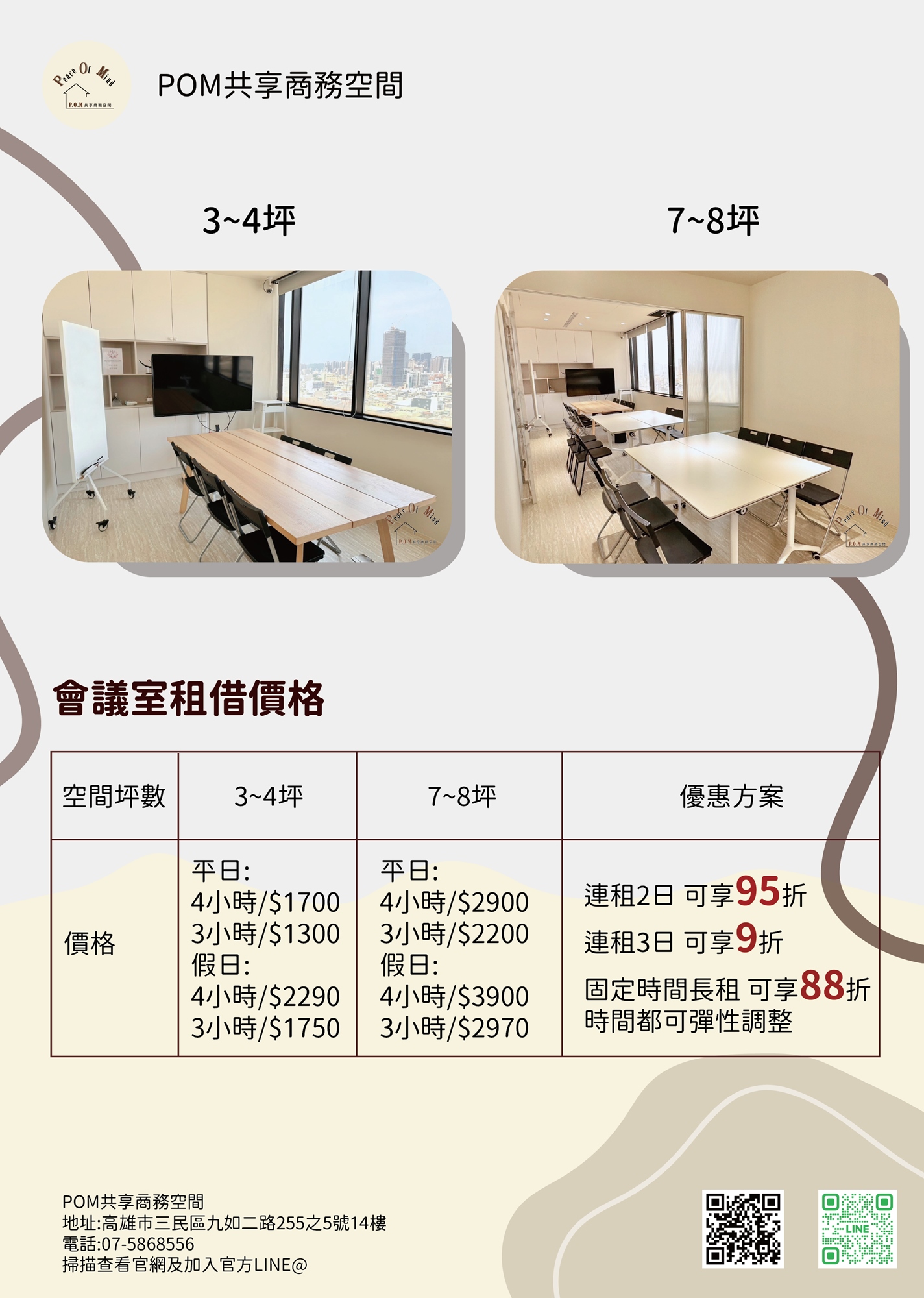 7.5坪會議室,燈光明亮,配有獨立空調,設備完善,提供所需基本會議設備,提供專業、便捷的會議空間,適合進行會議、說明會。 平日、假日收費及時段如圖片所示