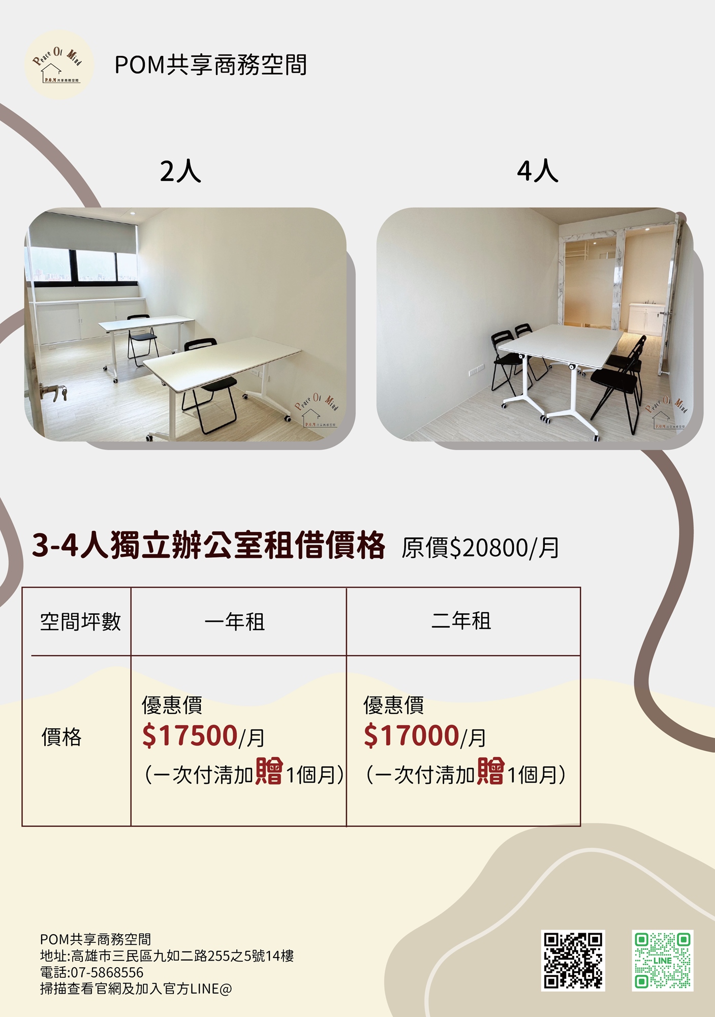 3.5坪獨立辦公室,柔和的燈光、舒適的辦公桌椅,讓您的工作氛圍更加舒適且提高工作效率。收費及時段如圖片所示