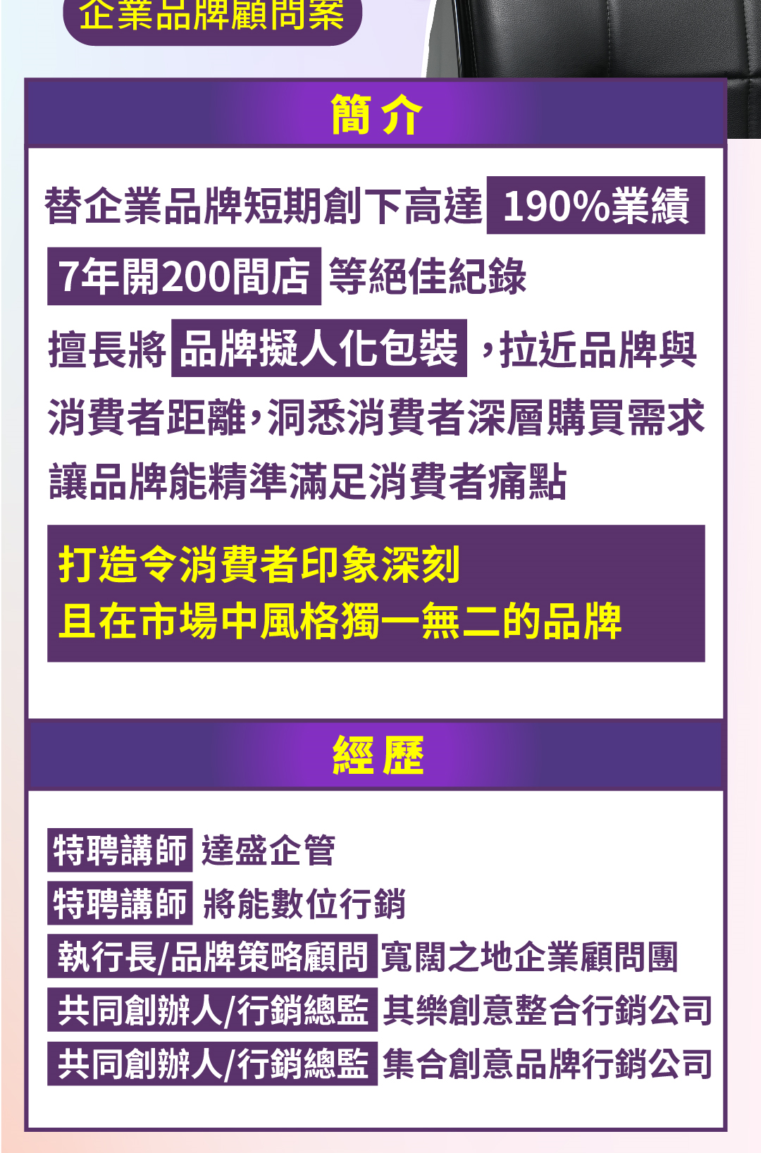 這堂講座告訴你如何精準掌握消費者心理,讓消費者掉入你精心製造的品牌行銷陷阱,主動花費購買你的產品滿足需求,並對你的品牌產生高度信任,主動將你的品牌分享出去,增加營收!