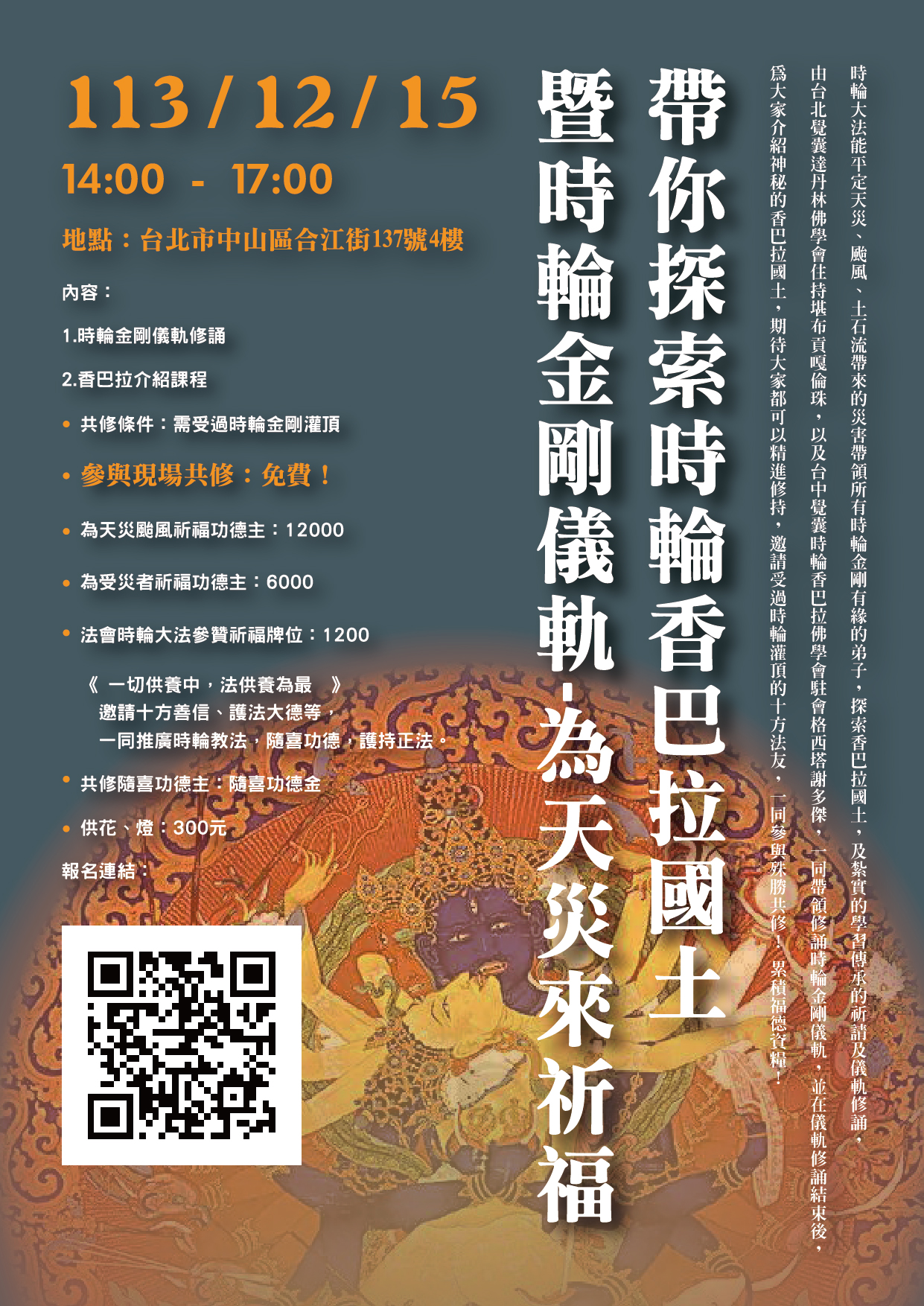 帶領所有時輪金剛有緣的弟子,探索香巴拉國土,及紮實的學習傳承的祈請及儀軌修誦,由台北覺囊達丹林佛學會住持堪布貢嘎倫珠,以及台中覺囊時輪香巴拉佛學會駐會格西塔謝多傑,一同帶領修誦時輪金剛儀軌,並在儀軌修誦結束後,為大家介紹神秘的香巴拉國土,期待大家都可以精進修持,