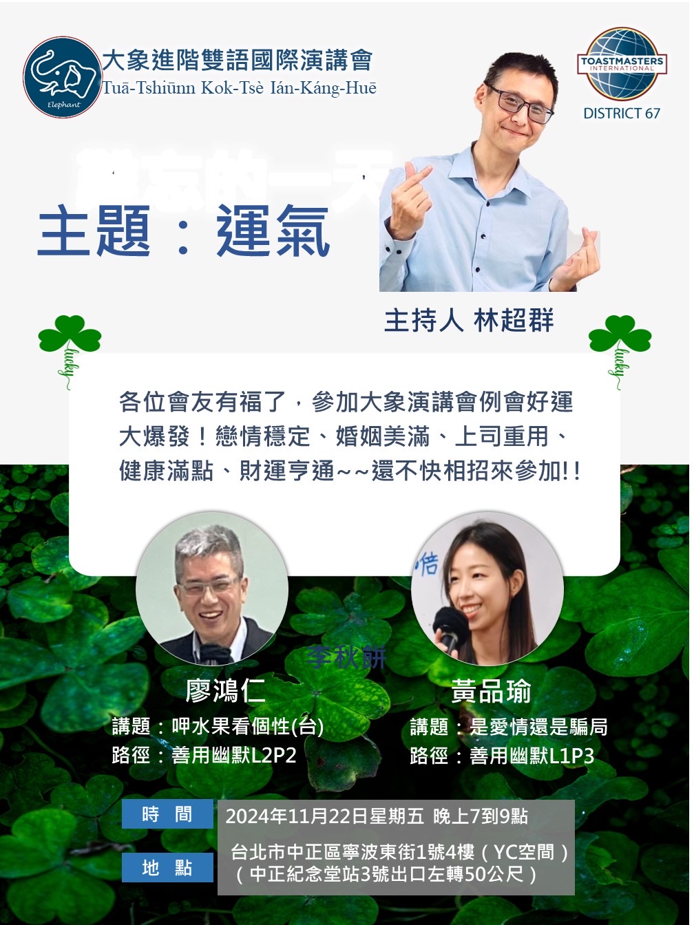 精彩節目由林超群總主持人、蕭忠文總講評帶領強棒主持群,保證知性與感性齊備,笑聲與掌聲齊鳴!希望各位會友,攜家帶眷、呼朋引伴來參加!