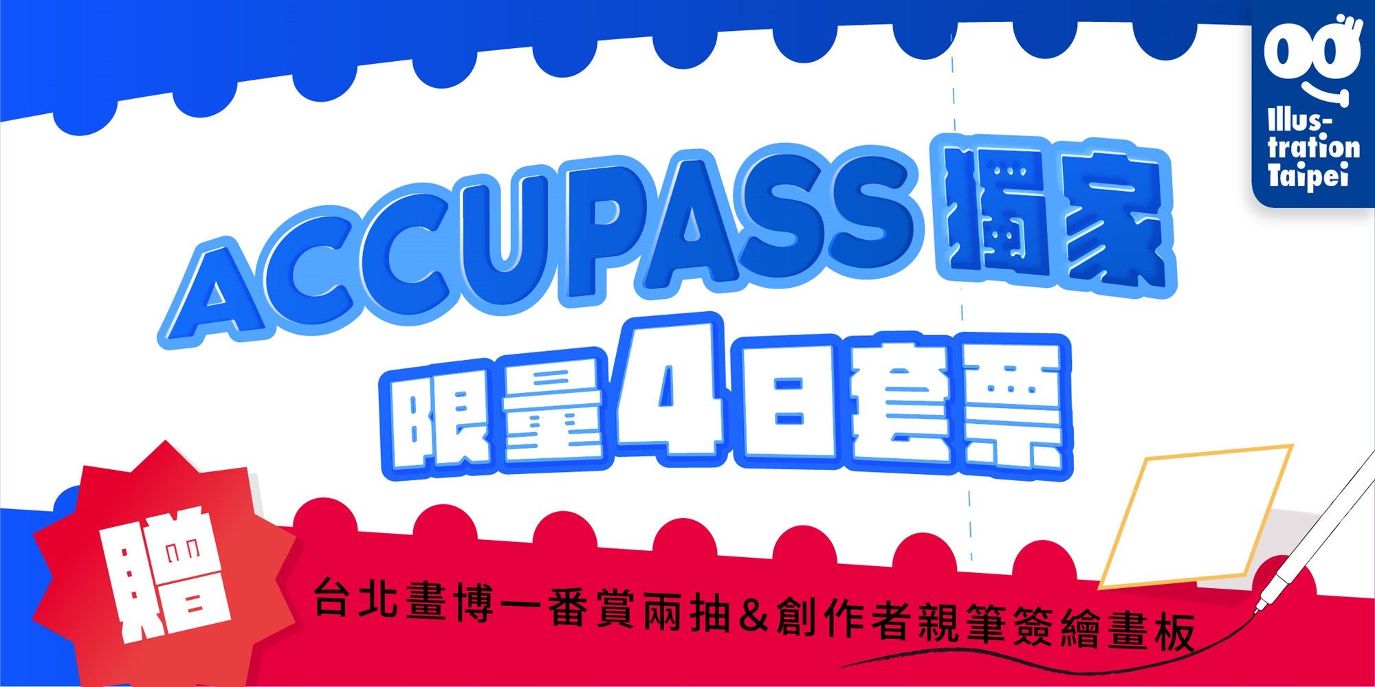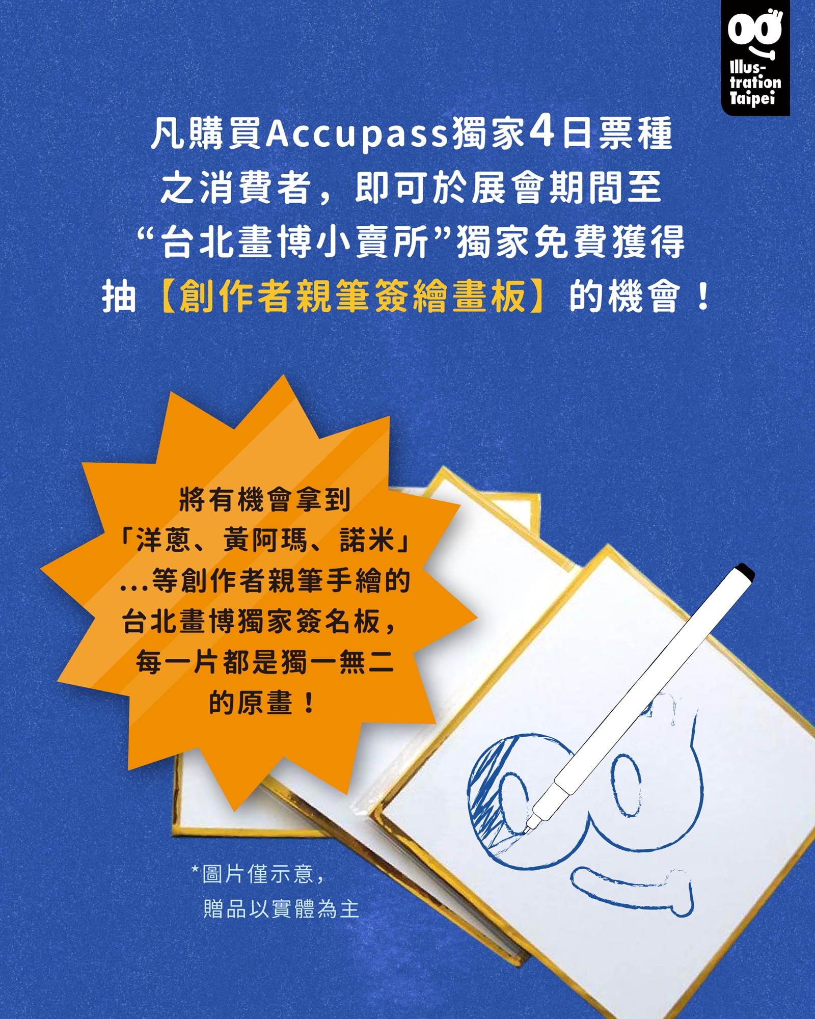 凡購買ACCUPASS獨家四⽇票種之消費者,即可於畫博期間⾄⼩賣所獨家免費獲得抽【創作者親筆簽繪畫板】的機會!將有機會拿到「洋蔥、黃阿瑪、諾米、於是⽇常了、地呱球等」諸多創作者親筆⼿繪的台北畫博獨家簽名板,每⼀片都是獨⼀無⼆的原畫!僅四⽇票種粉絲能夠抽籤!超⾼中獎機會!