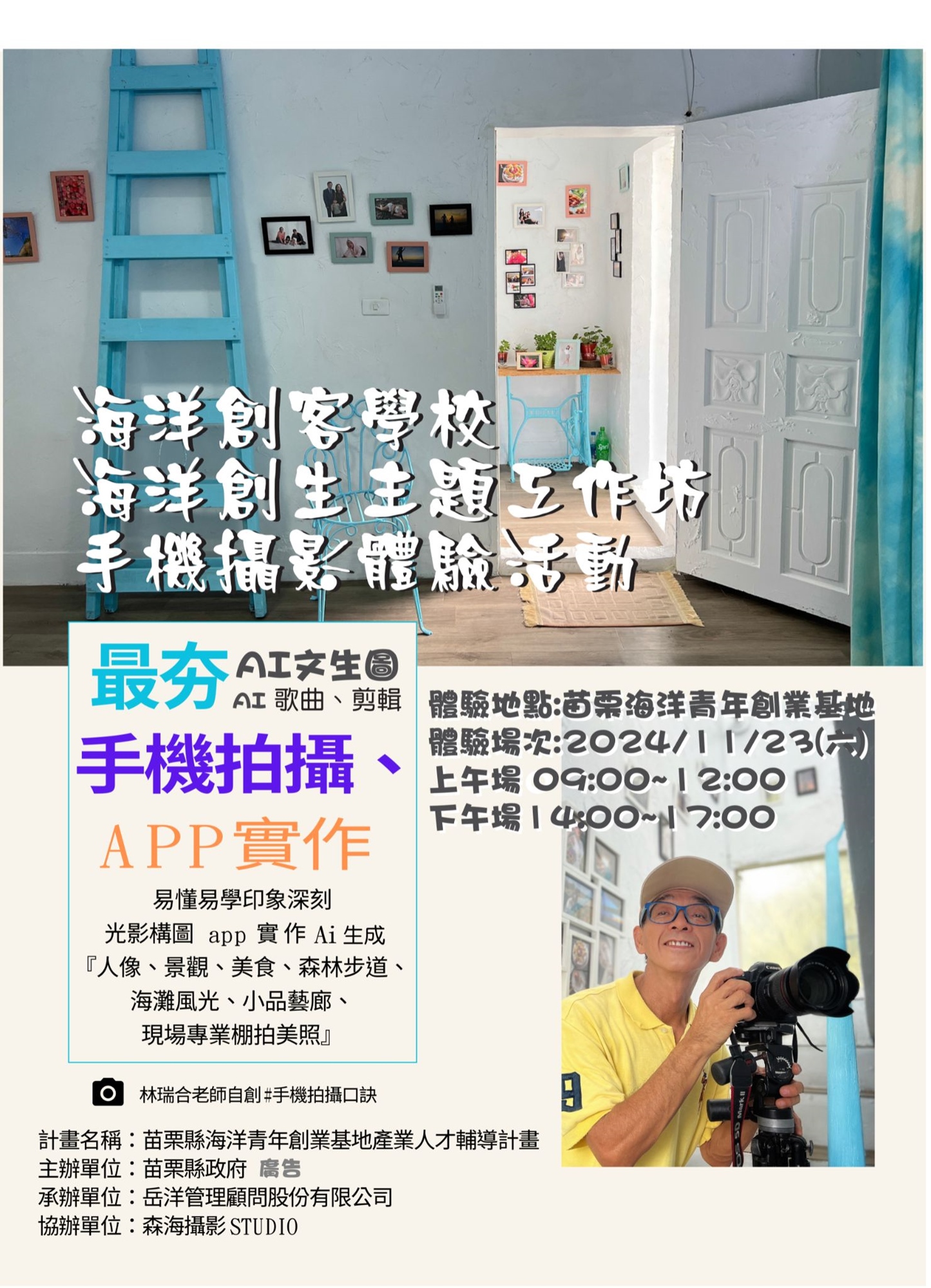 將教導大家關於人像攝影、光影構圖、AI運用,用手機及APP拍攝出竹南的海洋風光