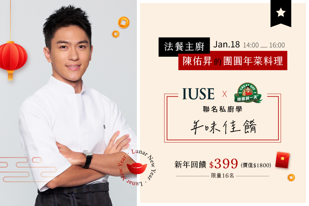 《IUSE x 得意的一天 聯名私廚學》特邀法餐主廚 陳佑昇 親授「年味佳餚」迎接農曆新年,將以精湛的法式技法融入傳統年菜風味,呈現出別具特色的「中法融合團圓饗宴」。精選天然食材與年菜中必備的涼菜、魚料理、湯菜等元素結合,讓法式的精緻與中式的豐富滋味相得益彰,增添年菜的口感層次。每道料理中皆融入健康元素,為年節團聚增添美好氛圍,讓家人共享團圓的美味與祝福!