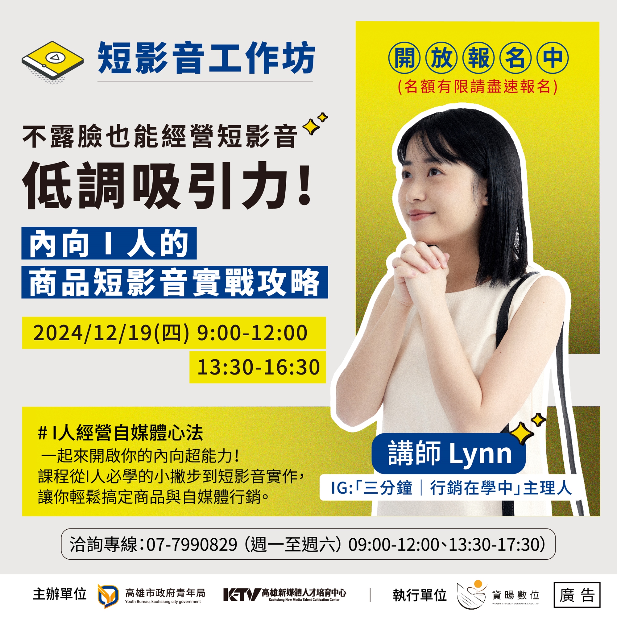 本堂課邀請到身為I人的Lynn老師,教你如何不露臉也能經營短影音,克服鏡頭尷尬癌。從內容心法到實戰技巧,還有超多I人必學的小撇步,讓你輕鬆搞定商品與自媒體行銷。