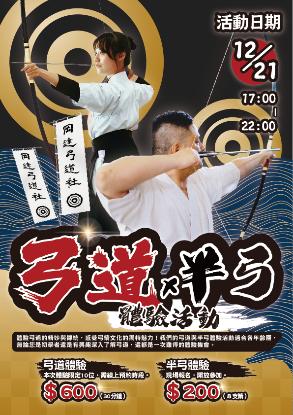 弓道體驗:適合對傳統文化、弓道藝術感興趣,並希望學習射箭技巧的參加者(16歲以上)。