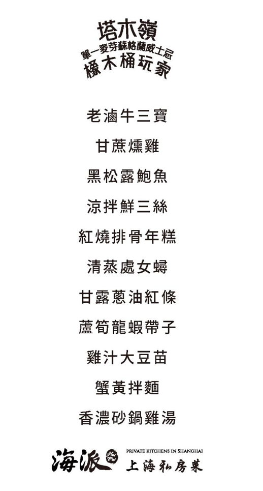 活動美饗:塔木嶺玩家專屬海派套餐 (原價NT$2,000) +塔木嶺威士忌 共五款