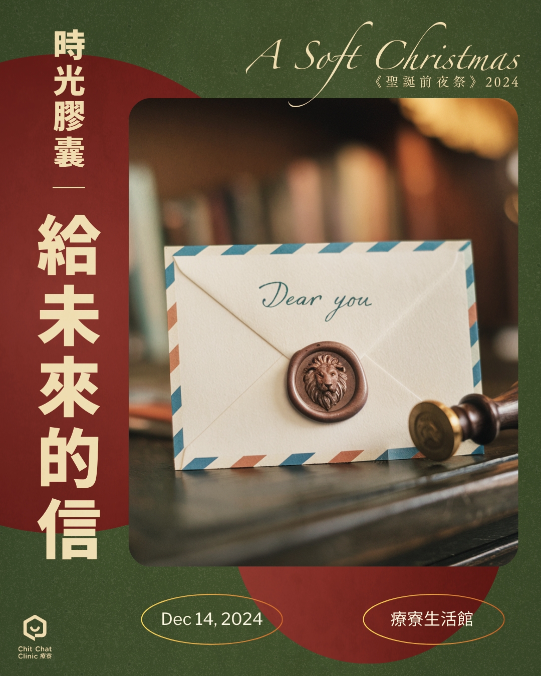 活動最後一個環節,將給每位參加者一份「私密的禮物」:寫下一封給未來自己的信,封存至明年的聖誕節。我們將用「復古熱蠟火漆印章」封存每封信,並寄放在療寮生活館,等到一年後的聖誕活動時,邀請您親自回來拆開這份專屬於自己的「時光膠囊」。