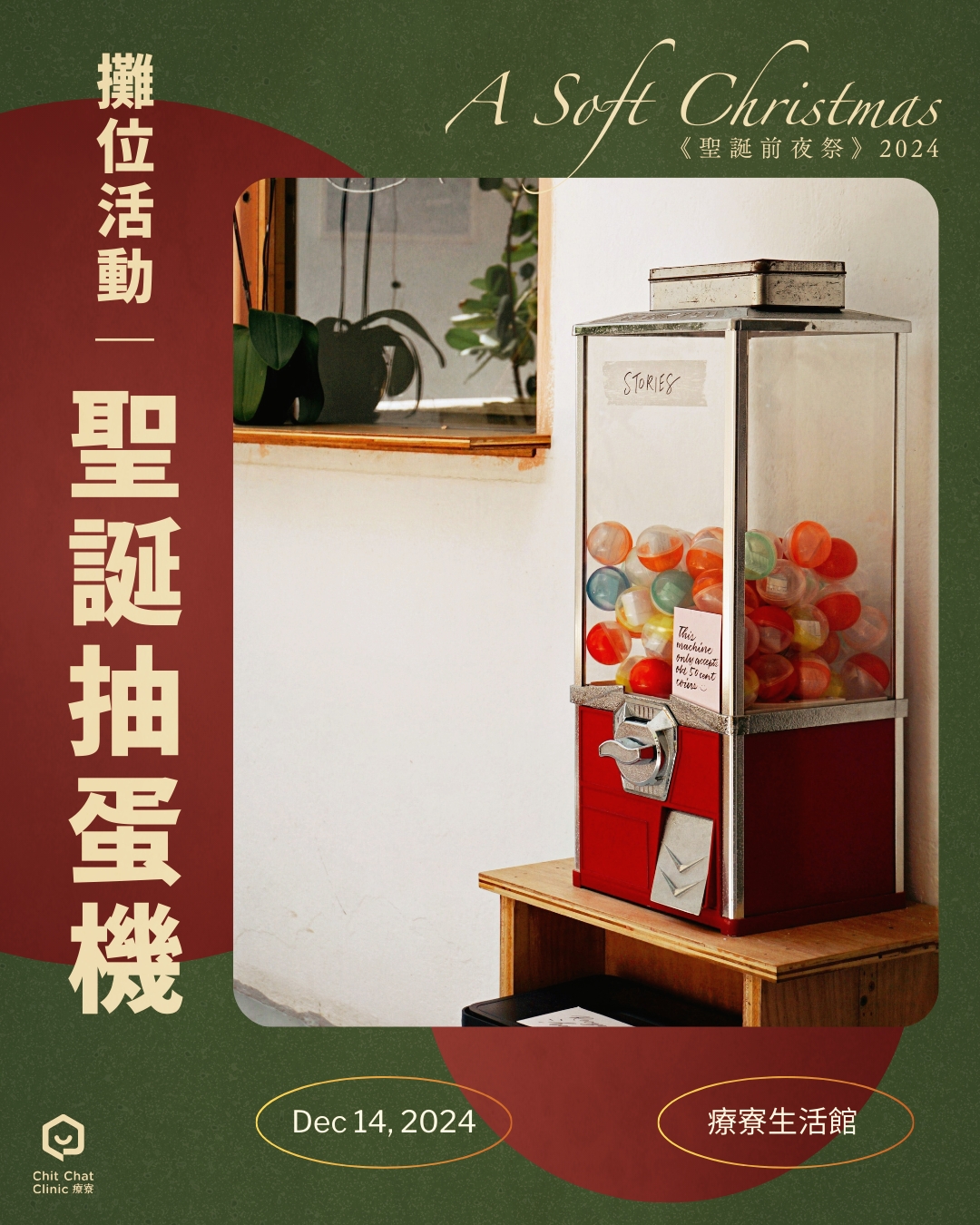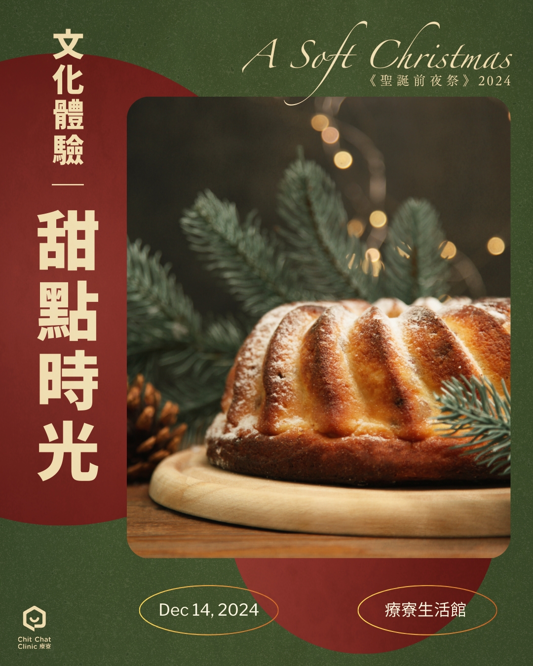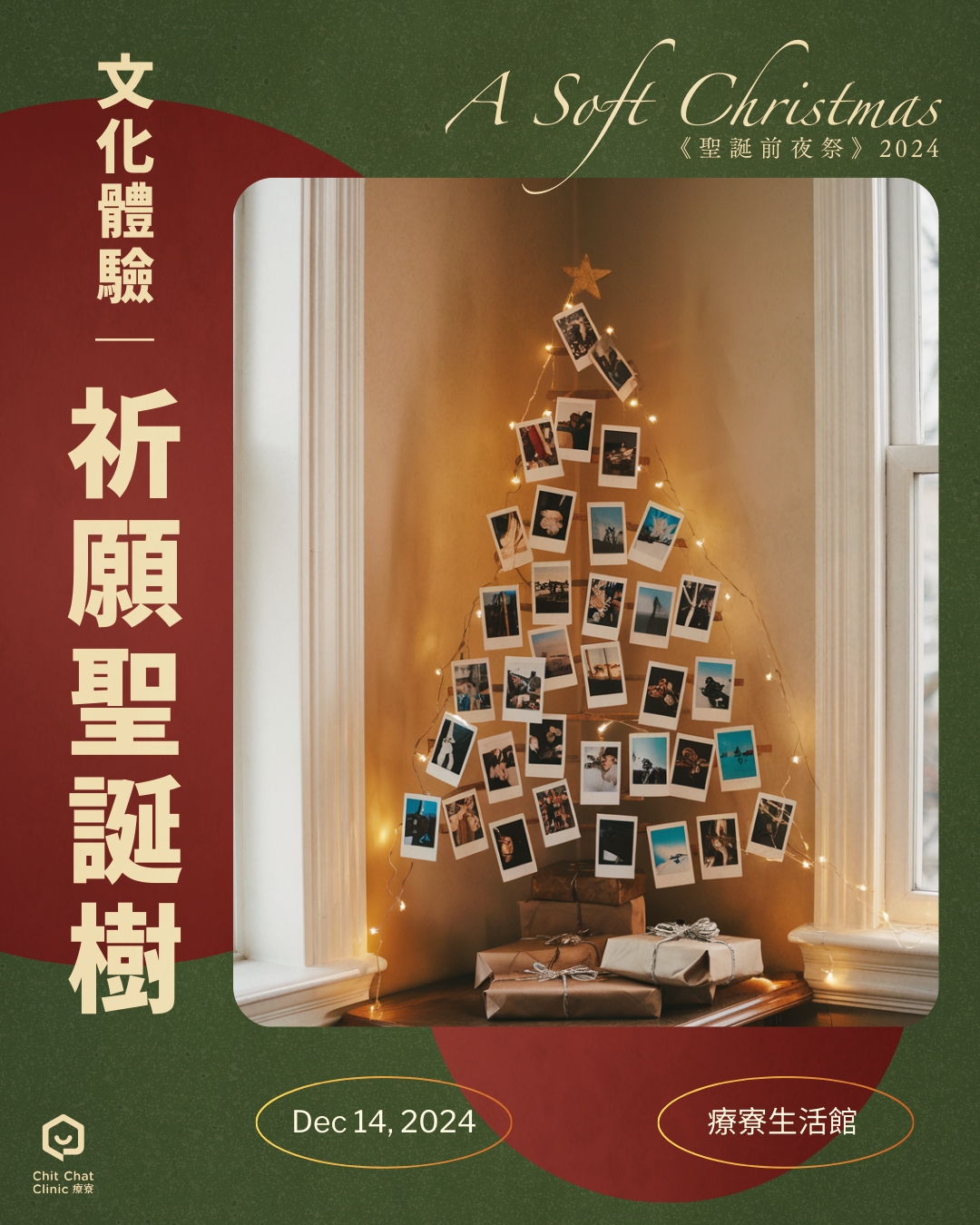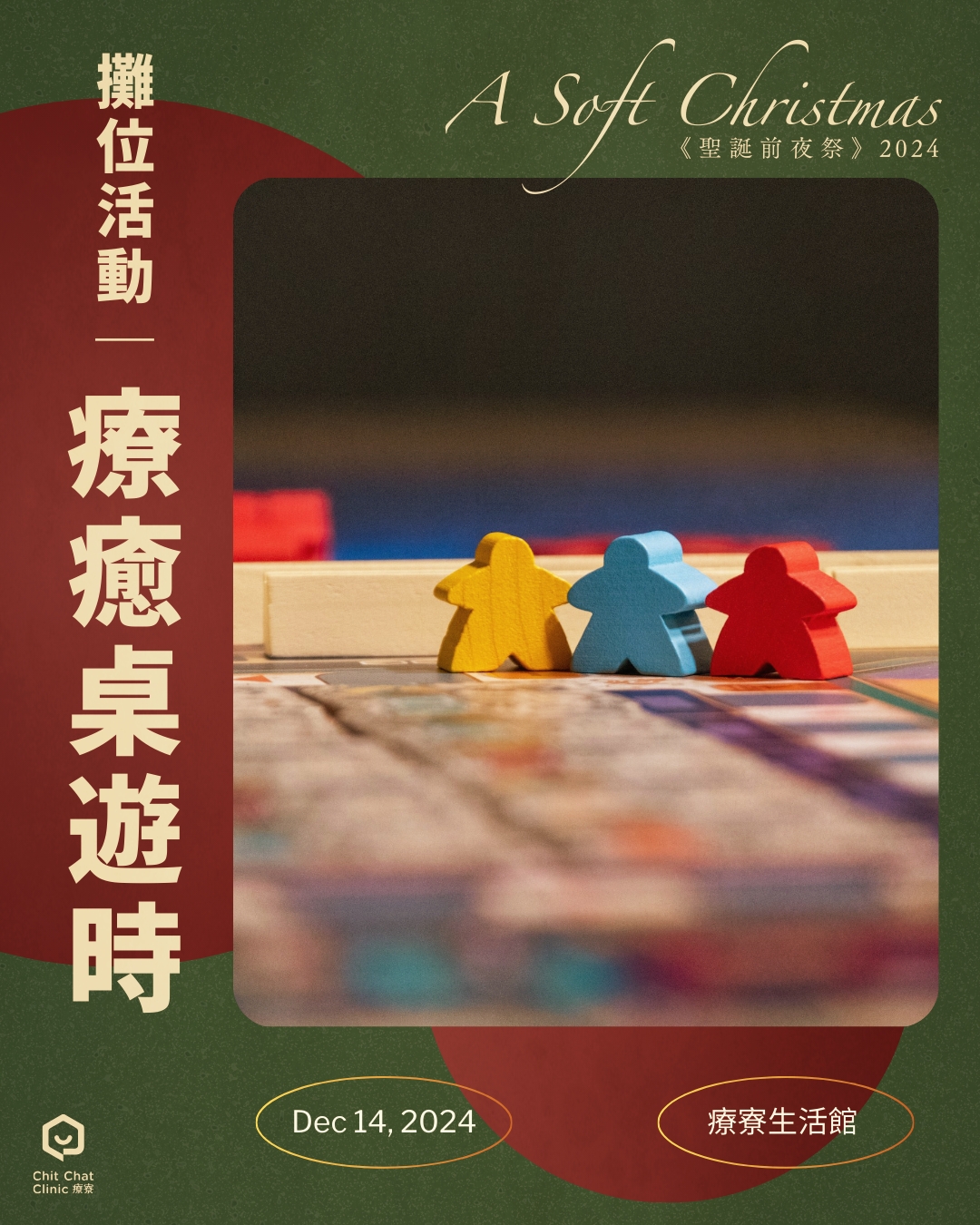 今年特別選在12/14(六)提前點亮聖誕的溫馨氛圍。從即影即有的祈願聖誕樹,到以桌遊為媒介的交流時光,再到時光膠囊的未來信,我們邀請您慢慢聊、慢慢療,輕鬆迎接新的一年。