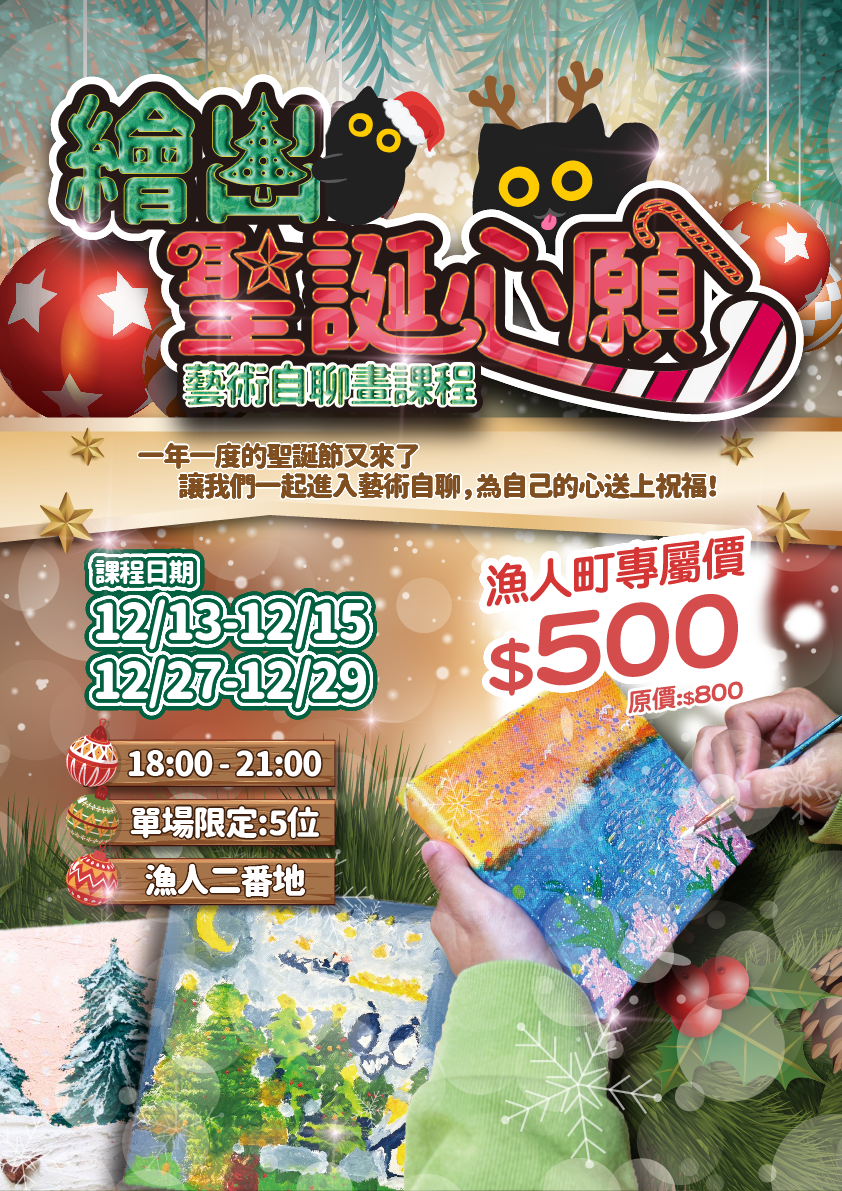 - 專屬療癒畫作:每位參加者都能完成一幅個性化的聖誕畫作,將心願化為色彩,為自己留下溫暖祝福。