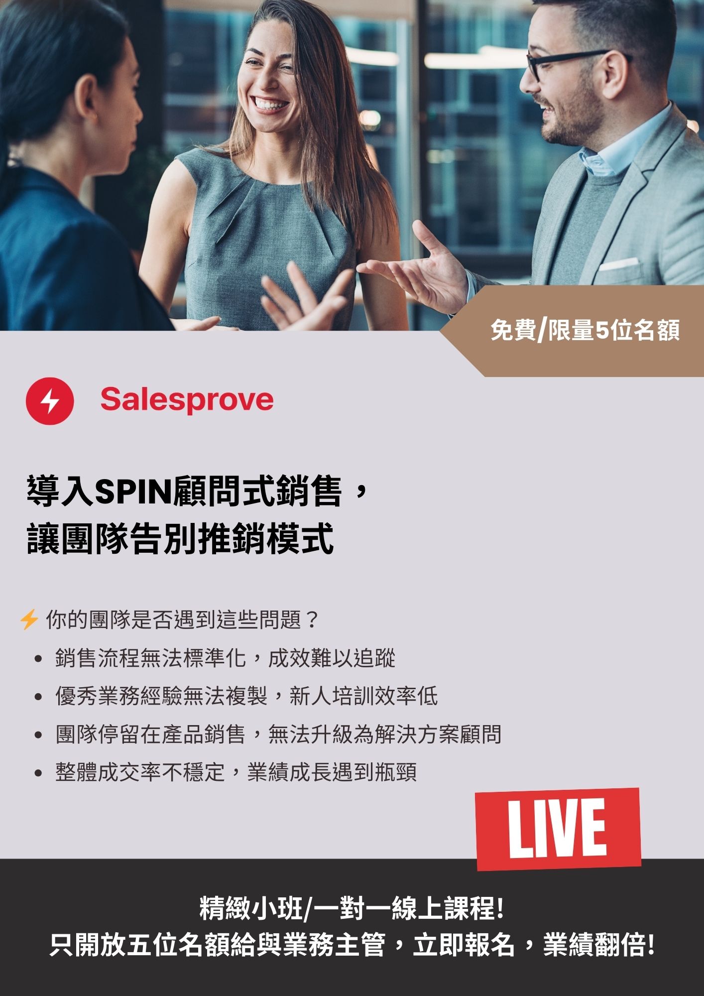 想知道如何帶領團隊突破業績瓶頸、提升整體成交率嗎?在課程中,Salesprove執行長Wilson將分享SPIN銷售系統的精華,幫助你建立團隊的標準化銷售流程、優化顧問式銷售技巧。透過系統性的SPIN訪談方法,讓您的團隊每一次客戶對話都更有成效,有效縮短成交週期。