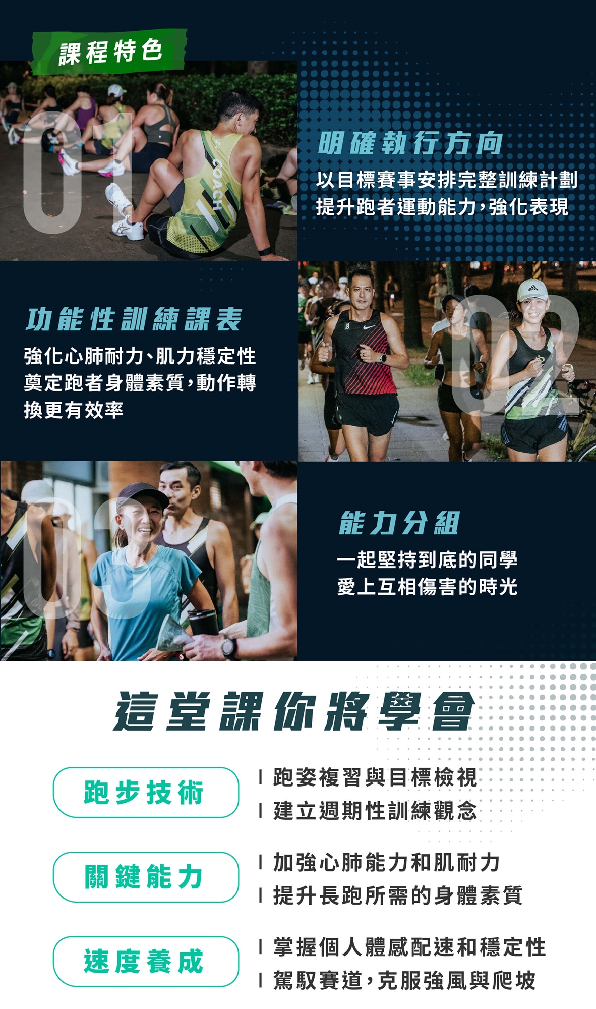 提升課表操作品質,堆疊全程馬拉松所需之跑量、體能與技術,協助跑者再次突破自我!