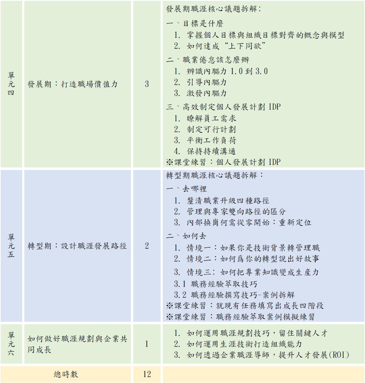 很多企業都有規劃講授職涯規劃的需求,希望員工藉由職涯規劃的學習能夠結合個人職涯目標與企業目標,從而激發員工的工作動力。但是這個話題在企業內部講授有很大的風險,一方面要讓員工對自己的職涯發展有想法,主動為自己的工作負責。另一方面又必須在組織內部發展,不能讓員工有離職的想法。本課程是萃取出在企業內講授職涯規劃課程的實戰經驗,從當前企業員工面臨的職業機遇與挑戰,到不同職涯階段策略的講解,透過講解與案例實作,激發員工工作主動性,進一步提升員工留任率的目標。