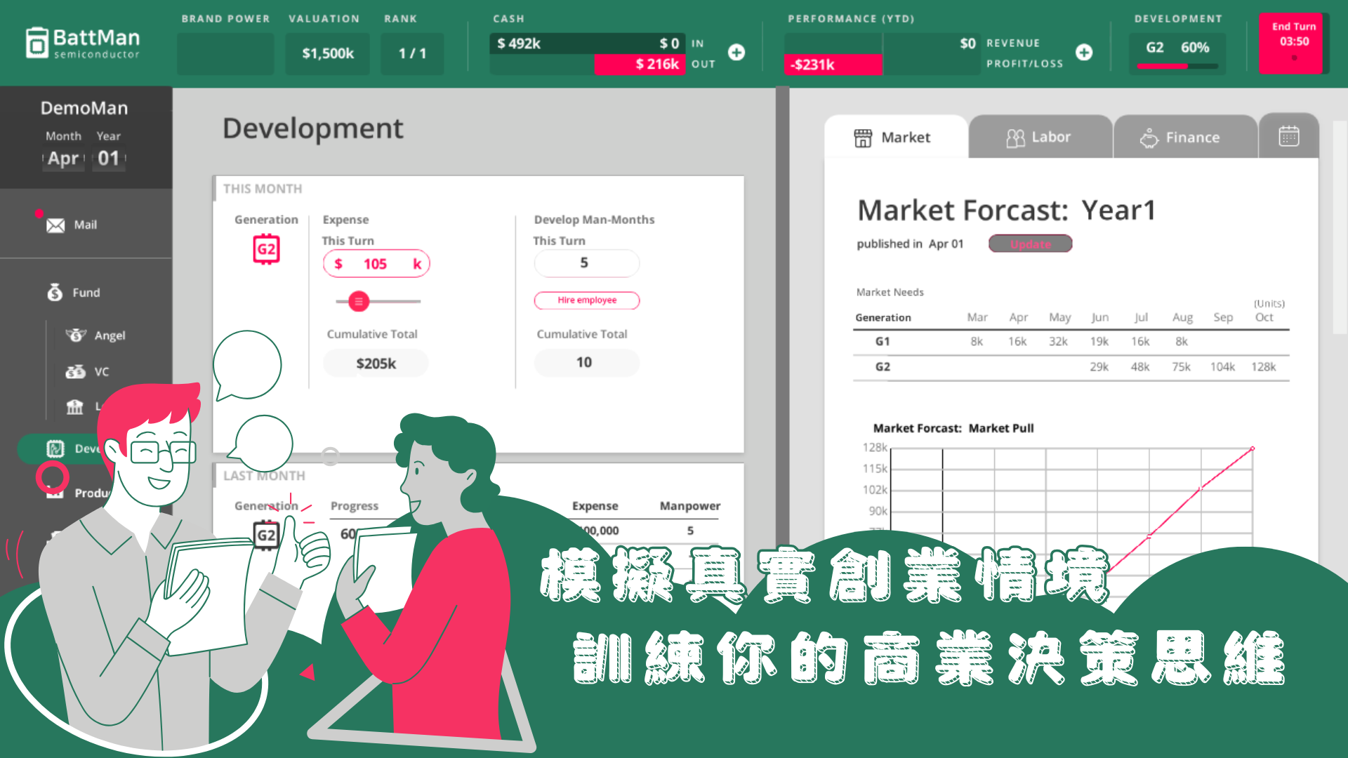 模擬重點:資源分配、人力管理策略、資金管理、股份稀釋策略以及規劃。