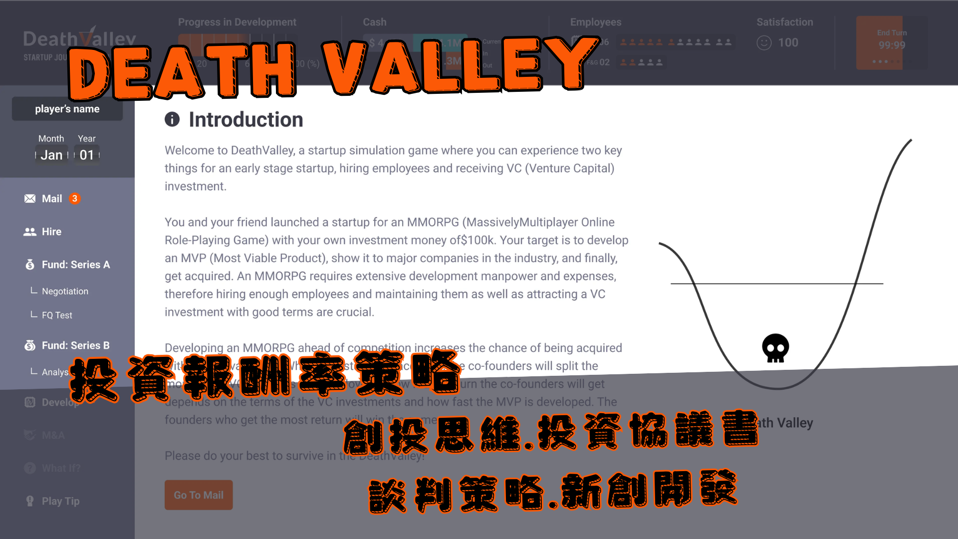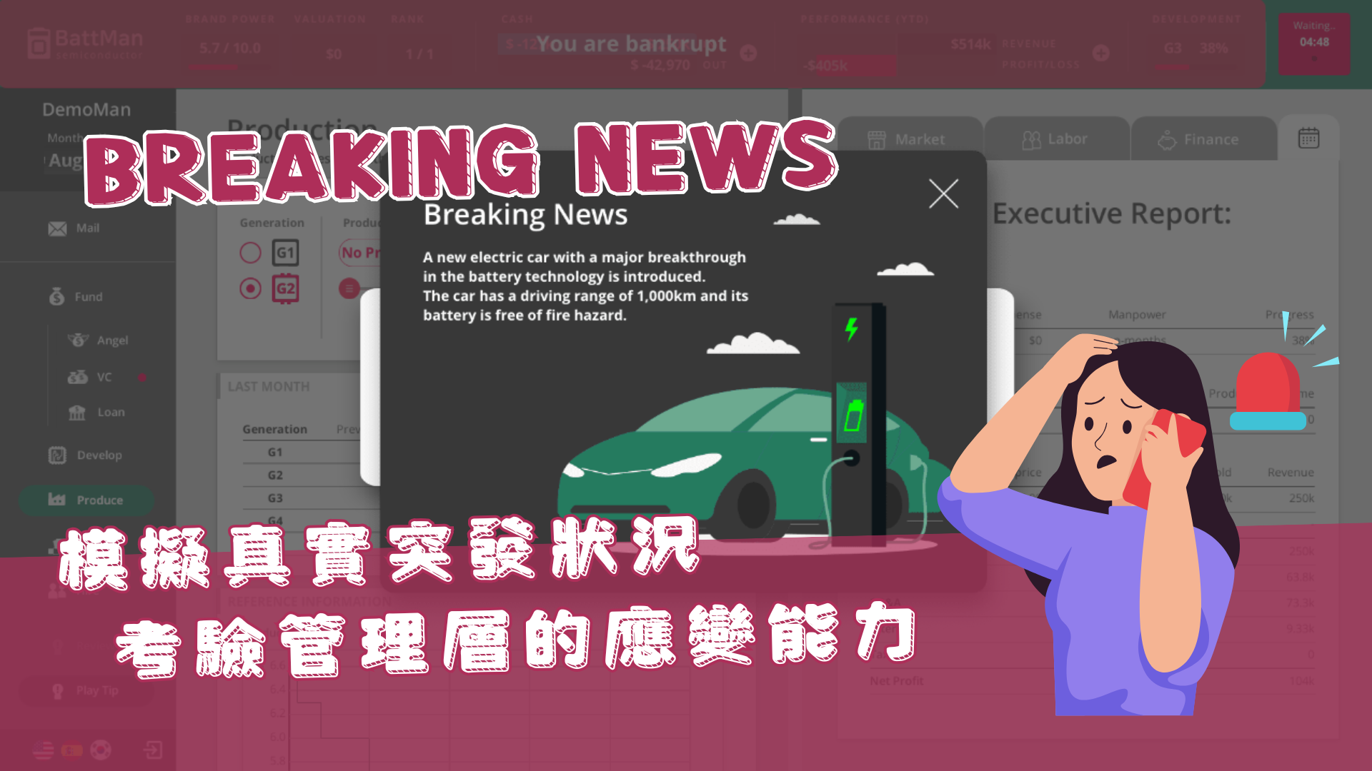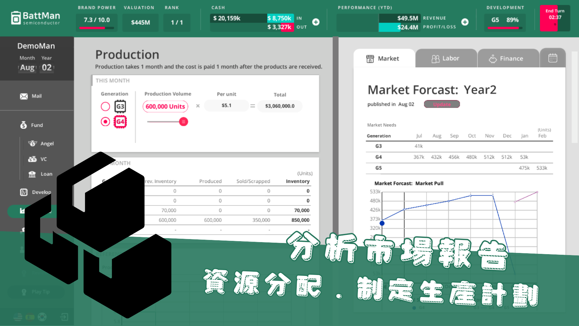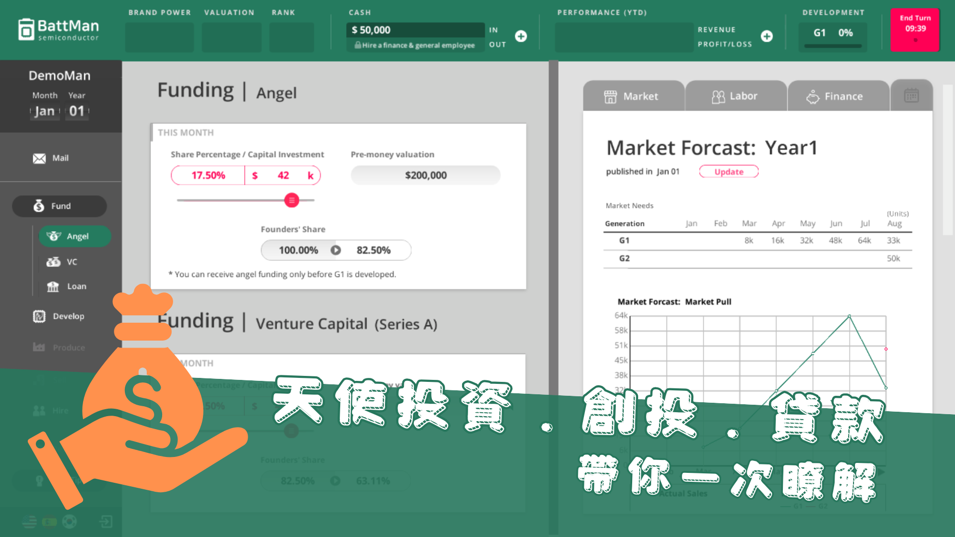 你與你的CTO決定要開發一個專門的電動車電池,開發過程中,你必須要謹慎的進行資金管理,在雇用足夠的人力進行開發的同時,你也要時常注意市場對於最新產品的需求,才不會落於人後,於最後公司估值最高的團隊將會獲得勝利。