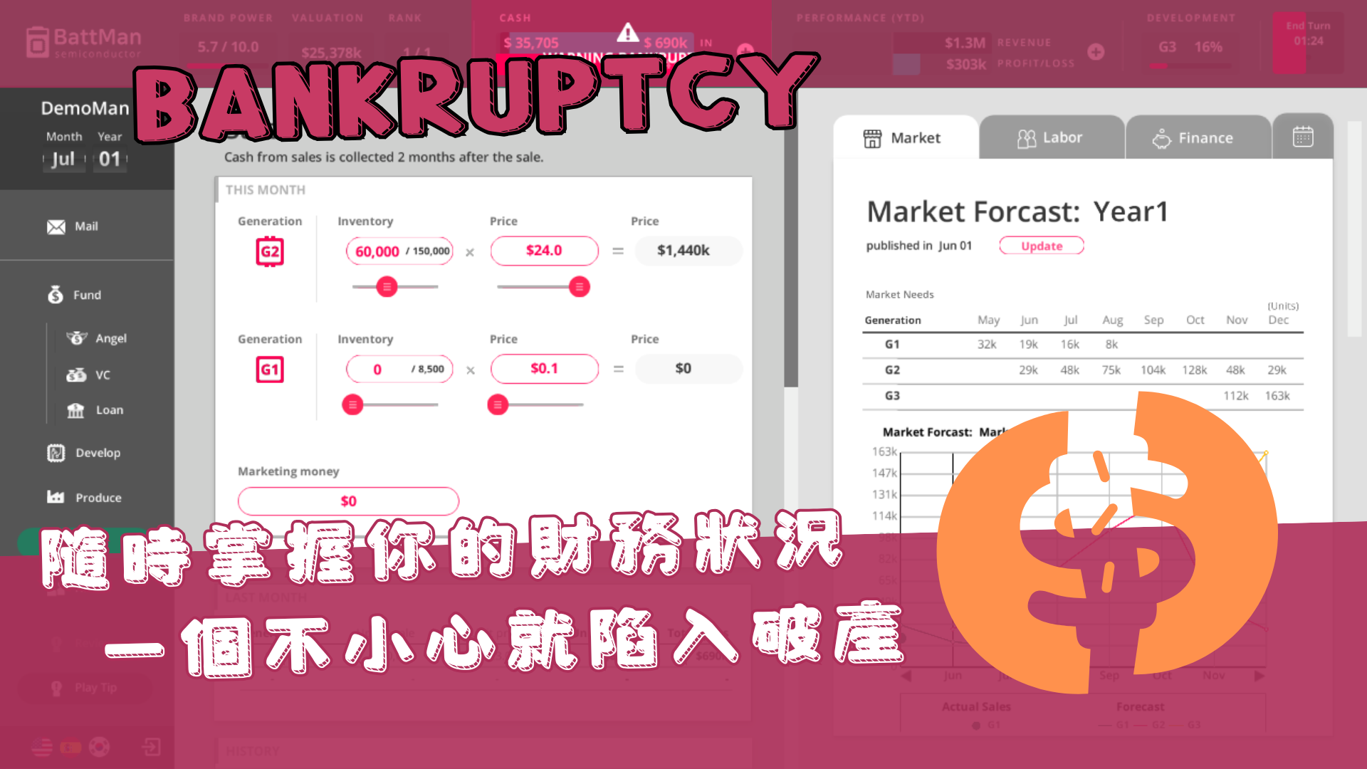 在有限的時間及資訊下,每位參與者都需要面臨資金不夠及破產的壓力,因此需要在短時間進行產品開發、市場研究、服務驗證以及產品銷售,避免過度樂觀導致公司現金水位不夠並且破產。