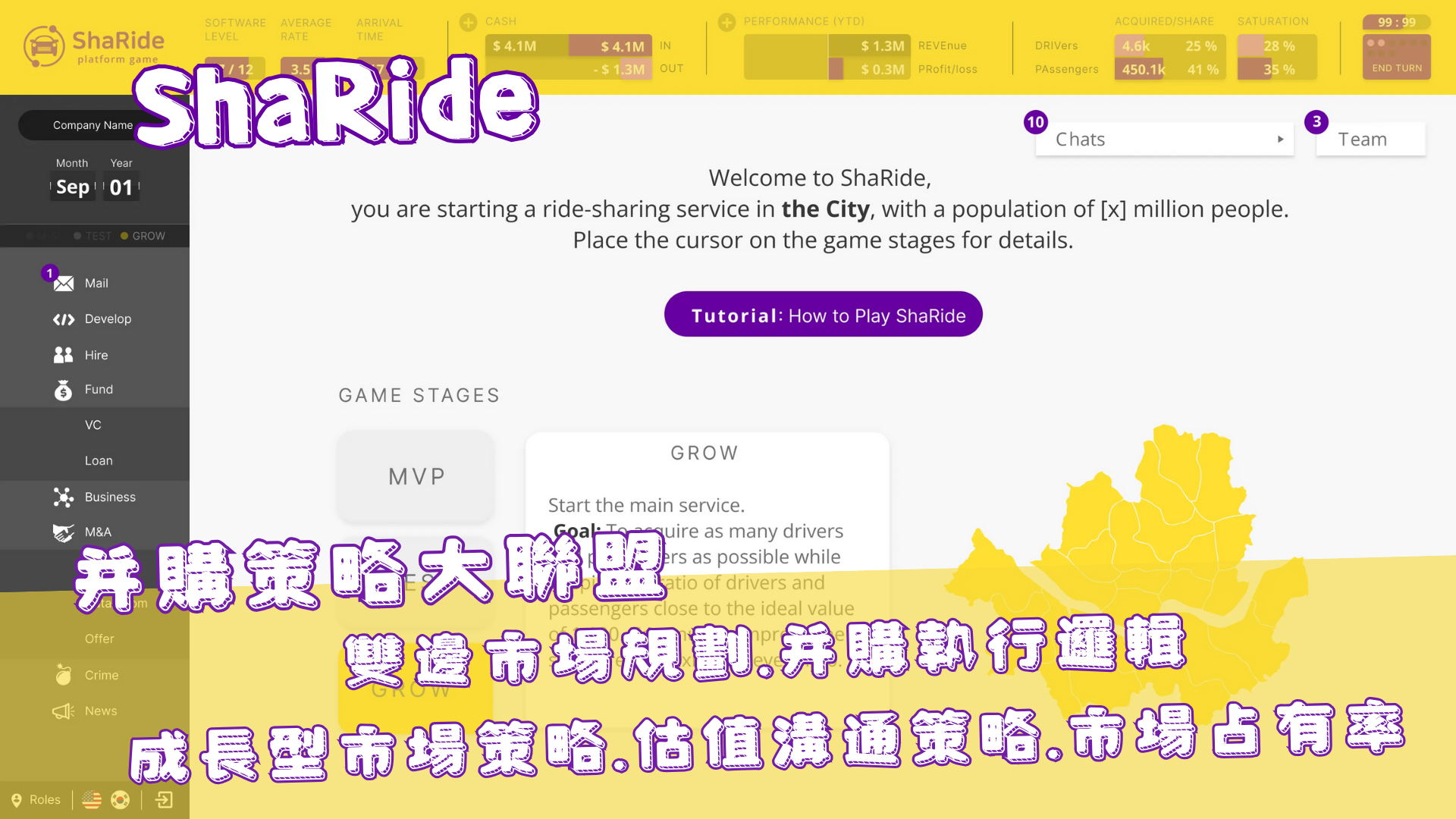 你決定開啟一個共享汽車的新創公司,在過程中,你需要同時滿足駕駛以及乘客的需求,同時你必須要小心其他虎視眈眈的團隊,他們正等著執行公開的併購計畫來危害你的市場佔有率。