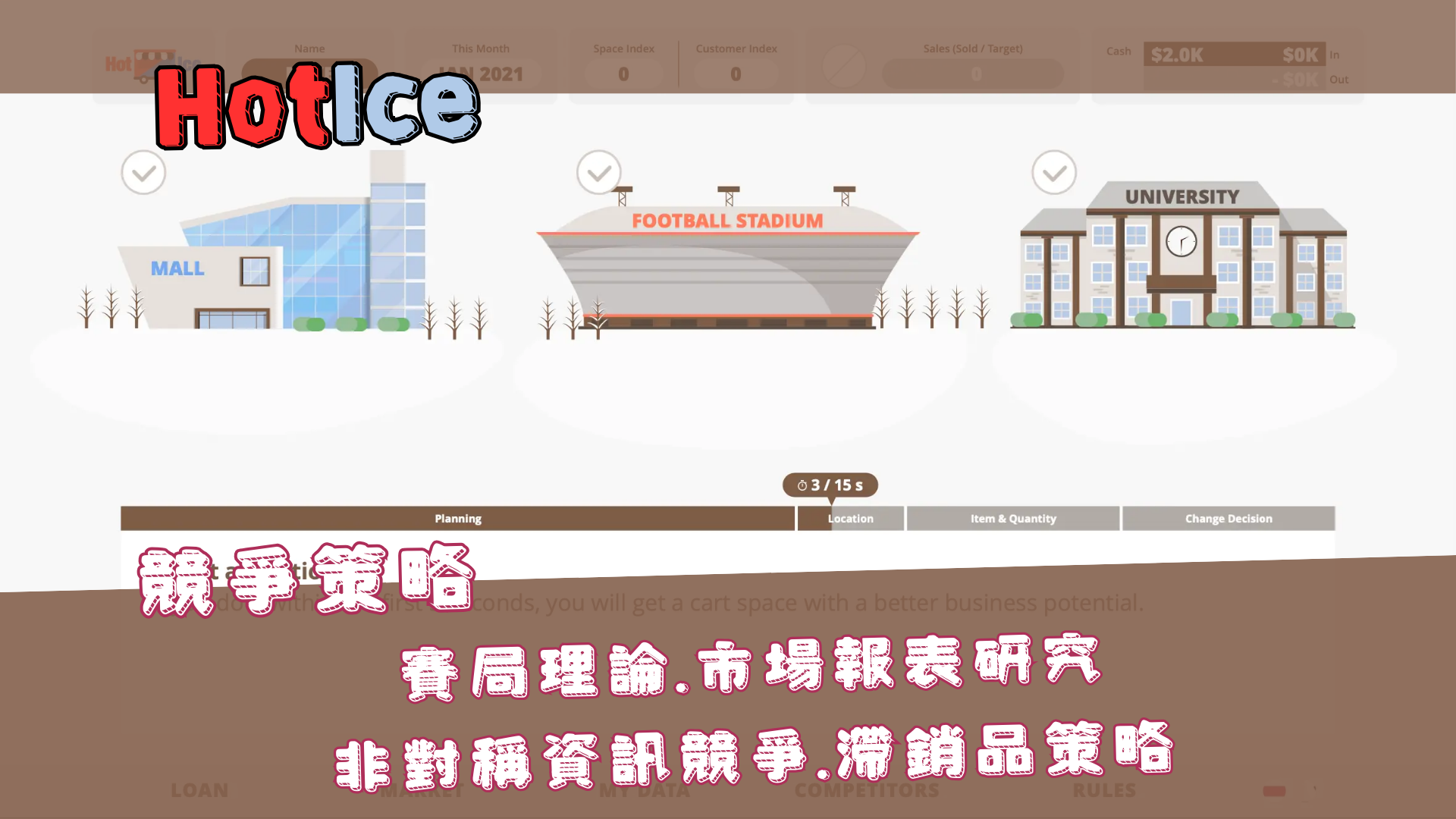 模擬重點:產品特質及滯銷品策略,競爭對手賽局分析,市場報表研究及非對稱資訊競爭。
