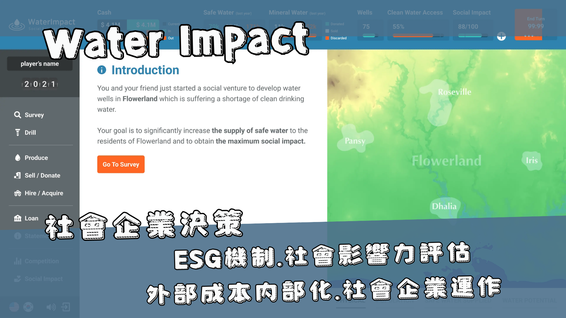 為了提供當地充足的飲用水,你決定開啟一個屬於你的社會企業,然而因為社會企業的原因,你無法與投資人進行募資,在維持公司營運的同時,設法的創造屬於你的社會影響力。