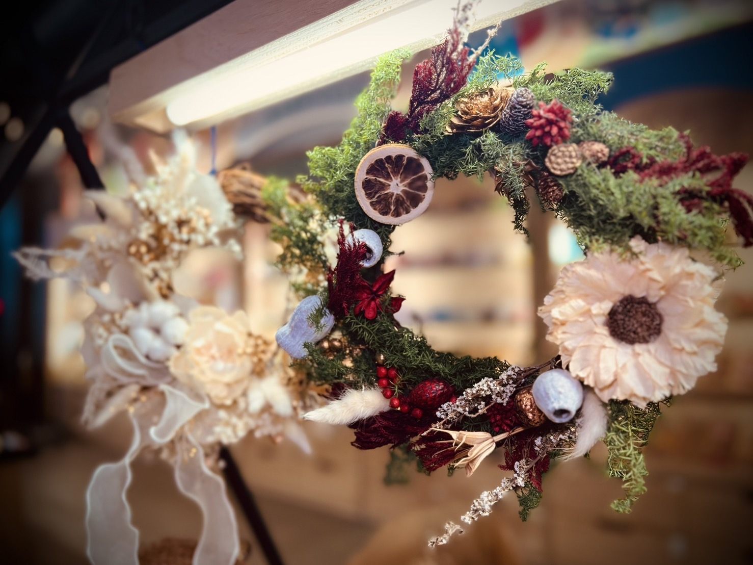 肉桂棒、松枝與永生花縱橫交錯,營造出濃濃溫暖的冬日的聖誕氛圍,創造屬於你個人的聖誕蠟燭花圈~