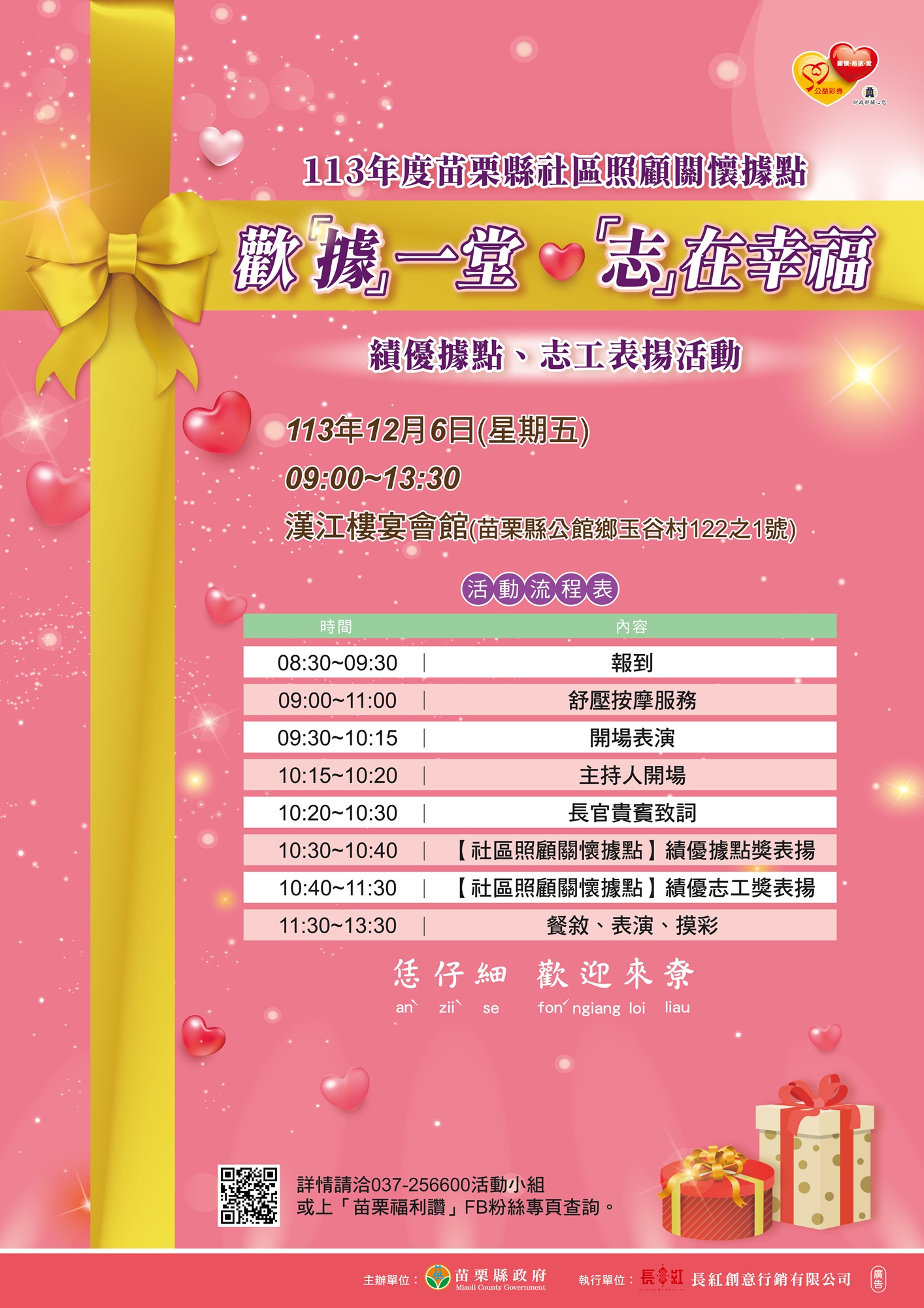 本次的「歡據一堂,志在幸福」績優據點、志工表揚活動旨在推崇敬老善行及熱忱無私的服務精神,並同時增進社會大眾對長者的關愛,深化尊老敬賢的價值觀。未來將持續向中央爭取補助經費及妥善運用公益彩券盈餘經費,積極輔導新單位成立社區照顧關懷據點,並協助改善設施和提供相關資源,朝向一村里一據點設置為目標,落實實踐「福栗佈老樂活園」的政策,期盼營造世代共融,共生社區的願景,讓苗栗成為充滿幸福與關懷的城市。
