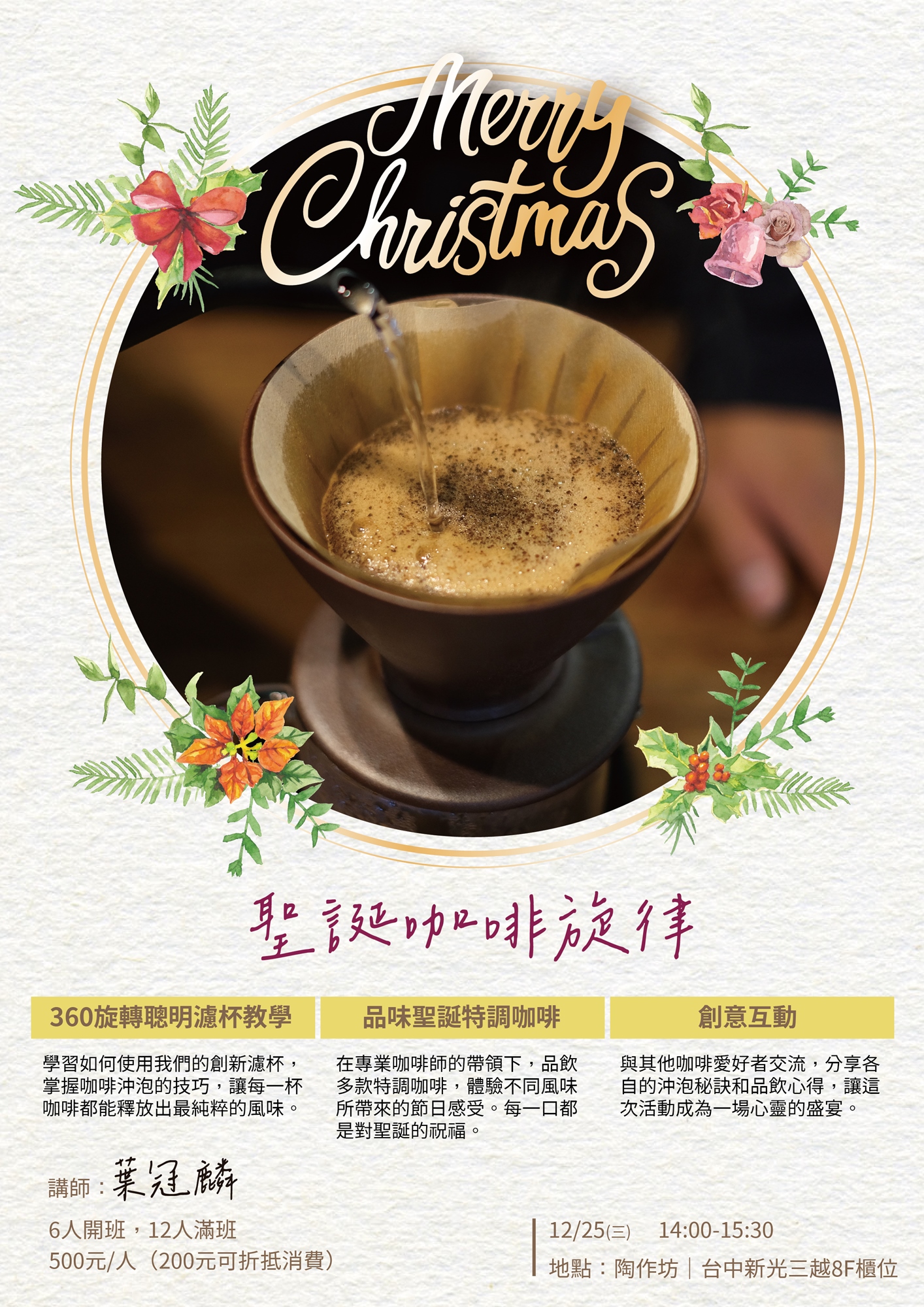 在專業咖啡師的帶領下,品飲多款特調咖啡,體驗不同風味所帶來的節日感受。每一口都是對聖誕的祝福。