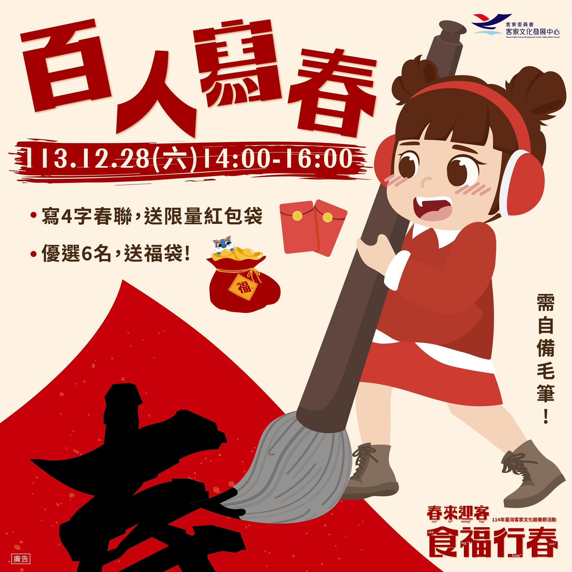 新年的腳步近了,來一起揮毫迎接春天吧!全國客家日「百人寫春」體驗活動,寫下象徵吉祥的四字春聯「春來迎客」,為家中增添濃濃的節慶氣氛。參加活動即可獲得限量版新春紅包袋,還有機會讓您的書法作品被專業書法老師選中,贏取精美福袋禮品!