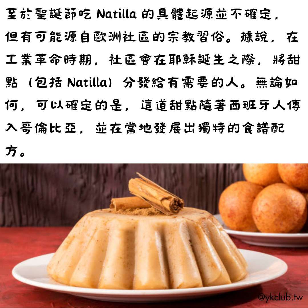 Natilla is a dessert originally from Spain, considered an essential dish on the Christmas table. Since the 1960s, it has become a traditional Christmas food in Colombia, typically enjoyed only in December. Many people say, "Natilla is best enjoyed in December."