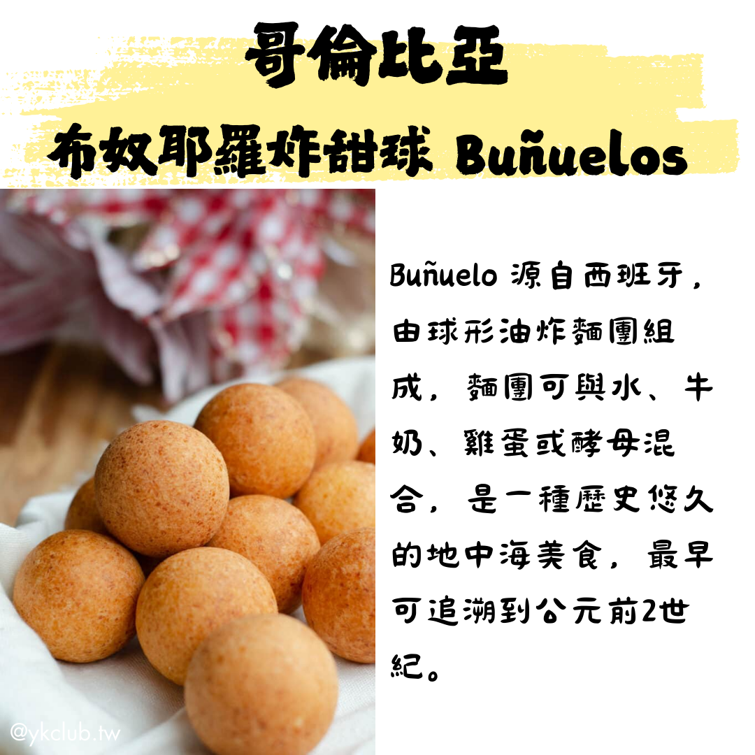- Buñuelos食材:玉米粉、木薯粉、起司、雞蛋、發酵粉、糖、鹽、牛奶