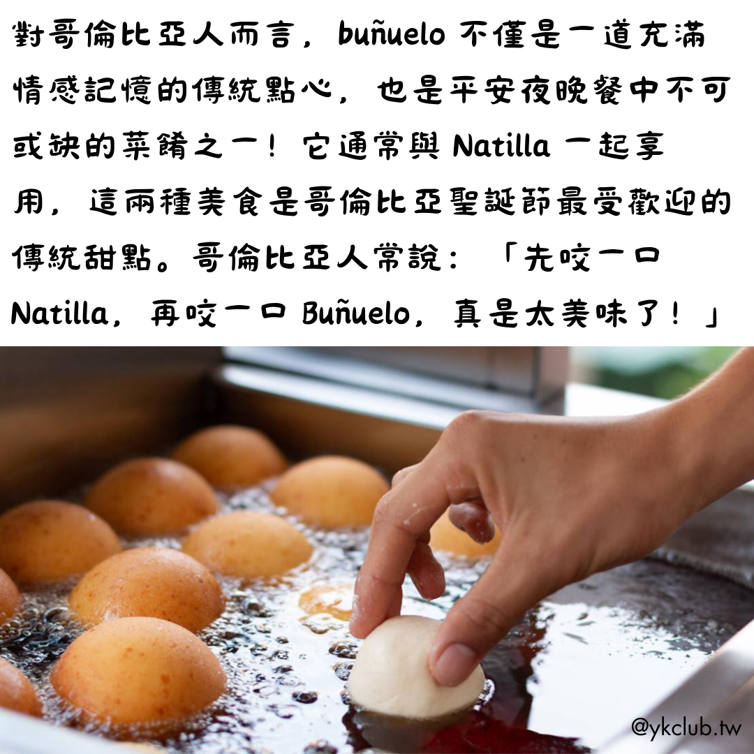 Buñuelo originates from Spain and is made of spherical fried dough. The dough can be mixed with water, milk, eggs, or yeast, and is a long-established Mediterranean dish, dating back to the 2nd century BC. For Colombians, buñuelo is not only a traditional snack filled with emotional memories, but also an essential dish during Christmas Eve dinner! It is typically enjoyed with Natilla, and together, these two treats are the most popular traditional desserts for Christmas in Colombia. Colombians often say, "Take a bite of Natilla, then a bite of Buñuelo—it's absolutely delicious!”