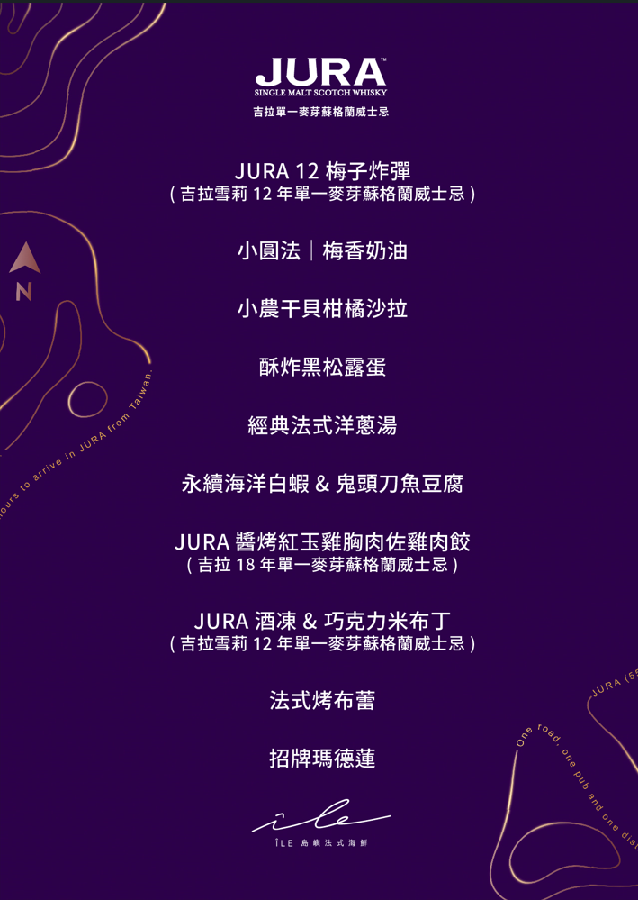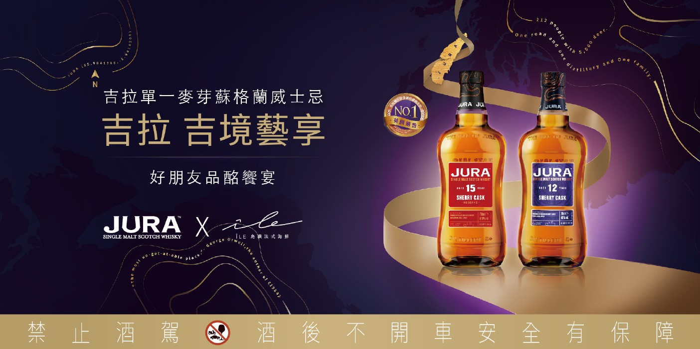 ● 品飲酒款:吉拉島嶼調酒-JURA Sunset、吉拉雪莉 12 年、吉拉雪莉 15 年 Reserve、吉拉 18 年、吉拉冬日