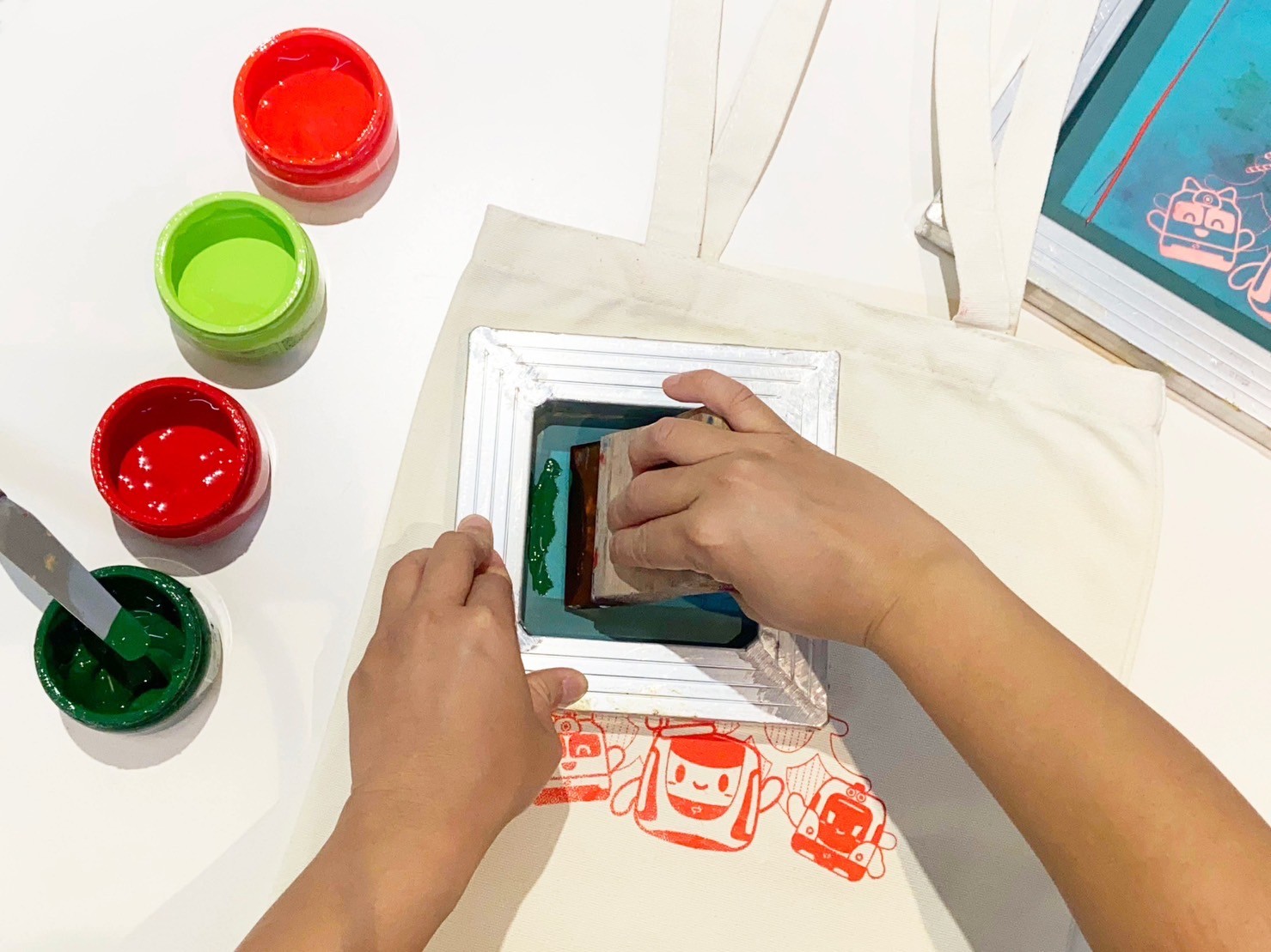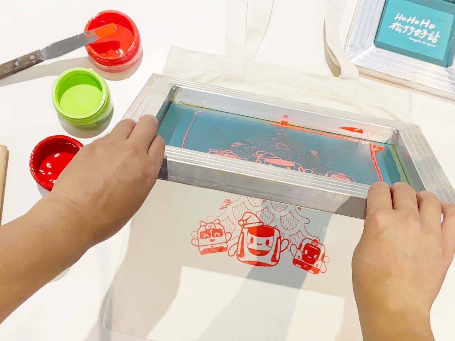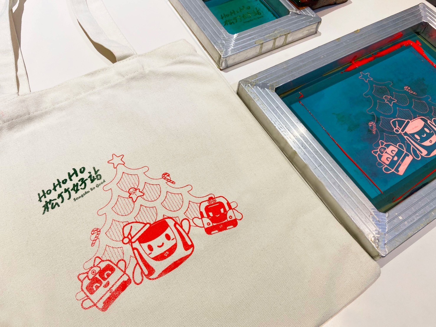 體驗內容:活動提供八種圖樣,含台中捷運吉祥物-小綠綠和磨磨、查查的聖誕圖及松竹站圖版等,運用紅、綠色油墨,自由排版,刷出屬於自己獨特的作品!