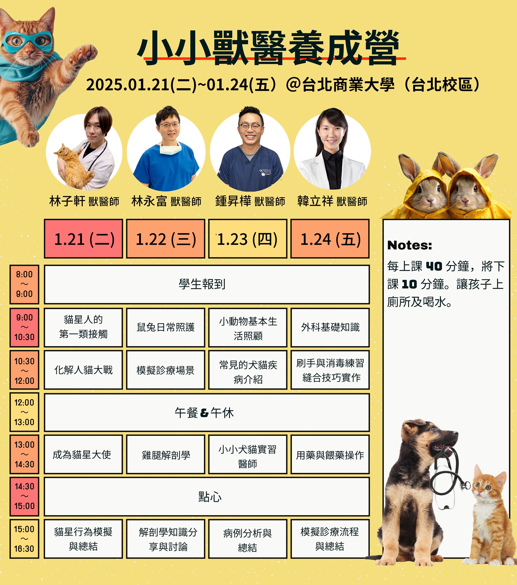 「未來小獸醫訓練營」 是一次探索動物醫學的奇妙旅程,歡迎所有對動物世界充滿好奇的小朋友加入,讓我們一起學習、成長,成為未來的動物守護者!