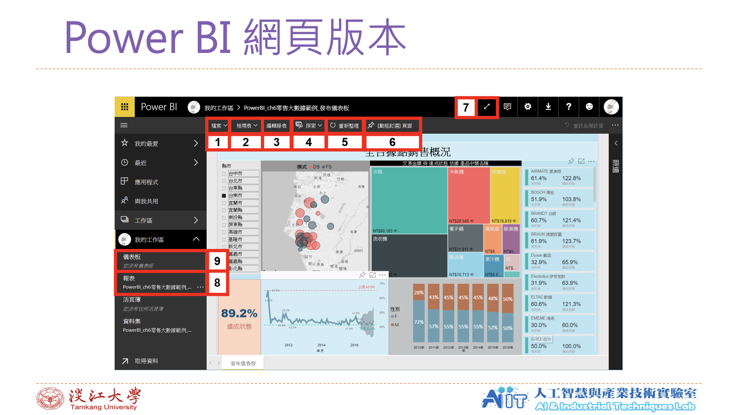 | Power BI | - 數據整理、統計分析、圖表創建以及數據視覺化。 - 提供交互式報表和儀表板,展示數據分析成果。 - 支援多種數據來源和數據格式。 | - 學生能夠進行數據分析和視覺化,呈現研究成果。 - 提供直觀的數據呈現,幫助學生更好地理解和傳達數據信息。 - 提升學生的數據處理和分析能力。 |
