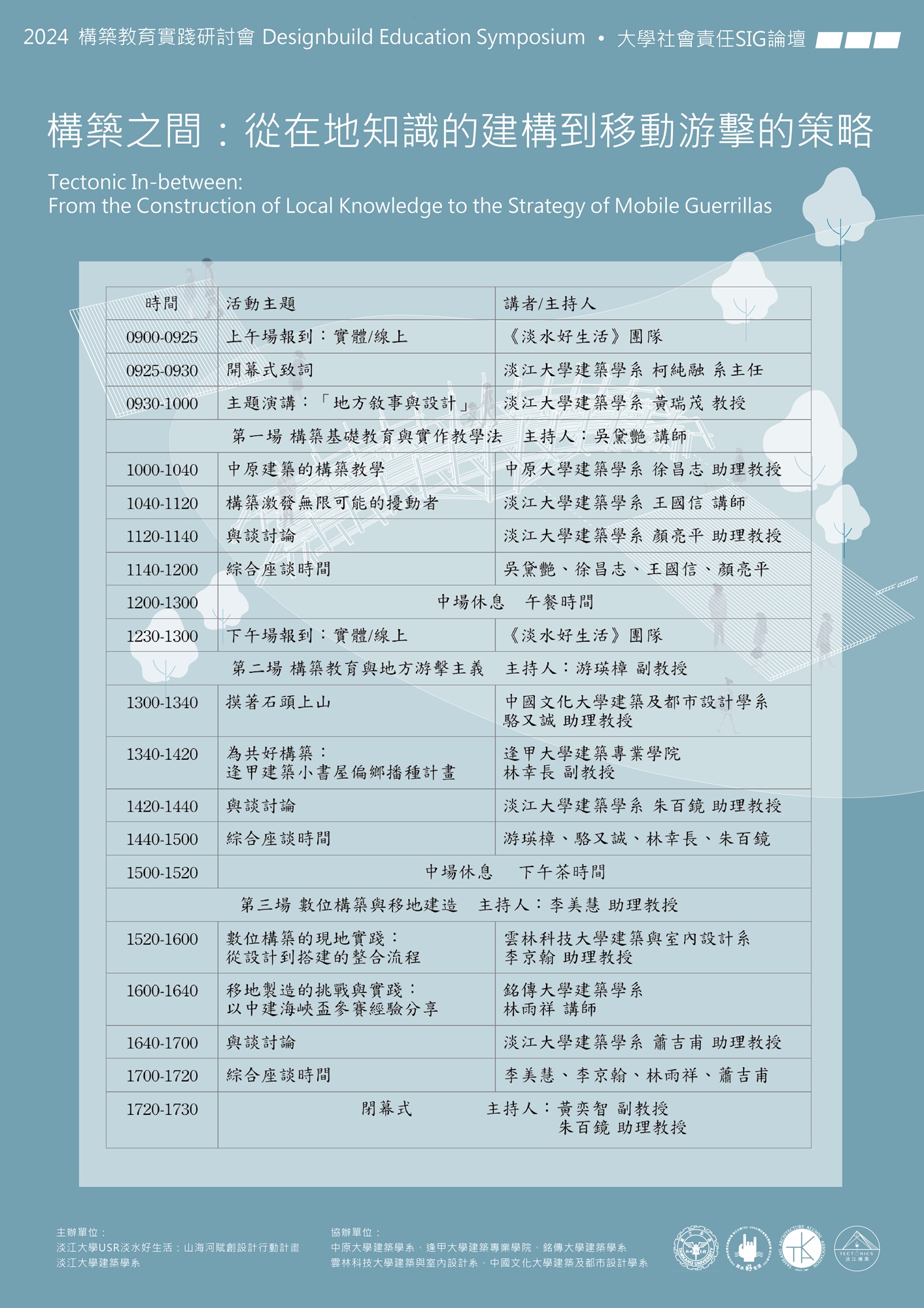 今年我們與淡江大學建築學系一同舉辦「2024大學社會責任SIG論壇暨構築教育實踐研討會」,以「構築之間:從在地知識的建構到移動游擊的策略(Tectonic In-between: From the Construction of Local Knowledge to the Strategy of Mobile Guerrillas)」為主題,