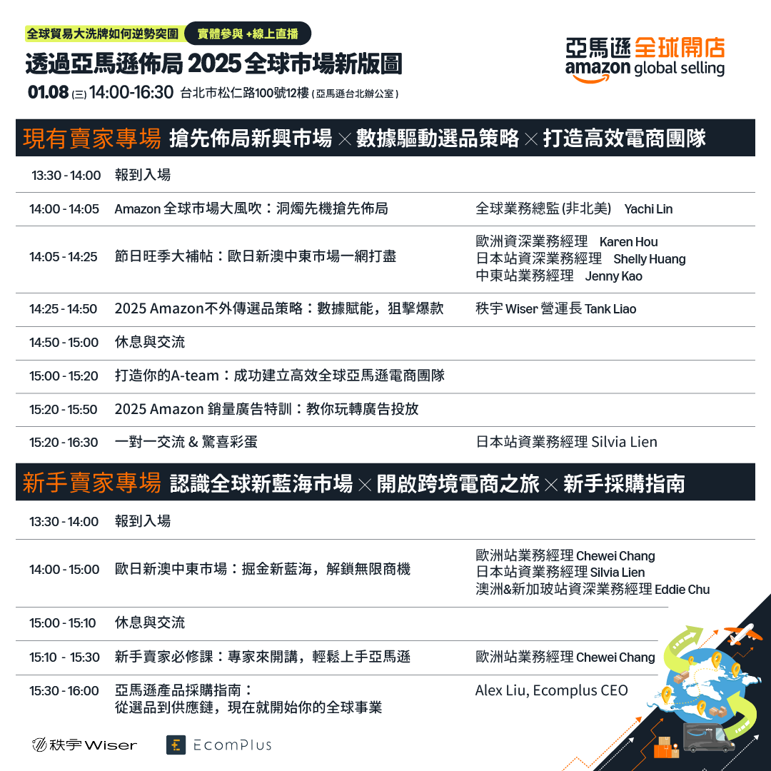 本次活動針對現有賣家和新手賣家分別設計專屬議程,內容涵蓋市場趨勢、選品策略、團隊建設、廣告投放等關鍵主題。無論您是資深賣家還是剛起步的新手,都能有所收穫,為迎接2025年全球市場新格局做好準備。立即報名,掌握先機,開拓您的全球電商版圖!