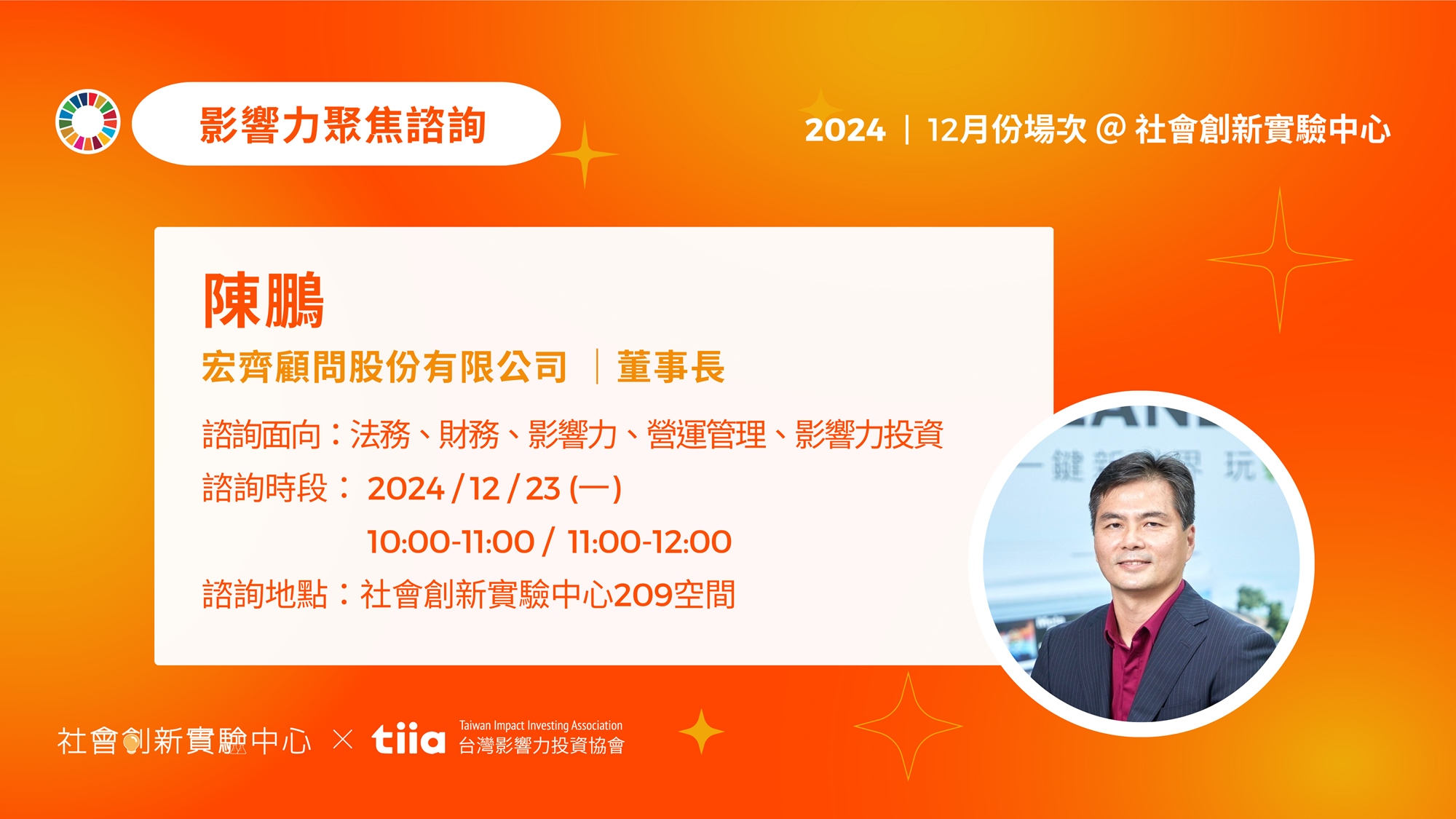 是由社會創新實驗中心(社創中心)與台灣影響力投資協會(tiia)合作的公益諮詢活動,將安排影響力投資、及各界專業領域大師在社創中心與您進行一對一的實體諮詢幫助創業者解惑。