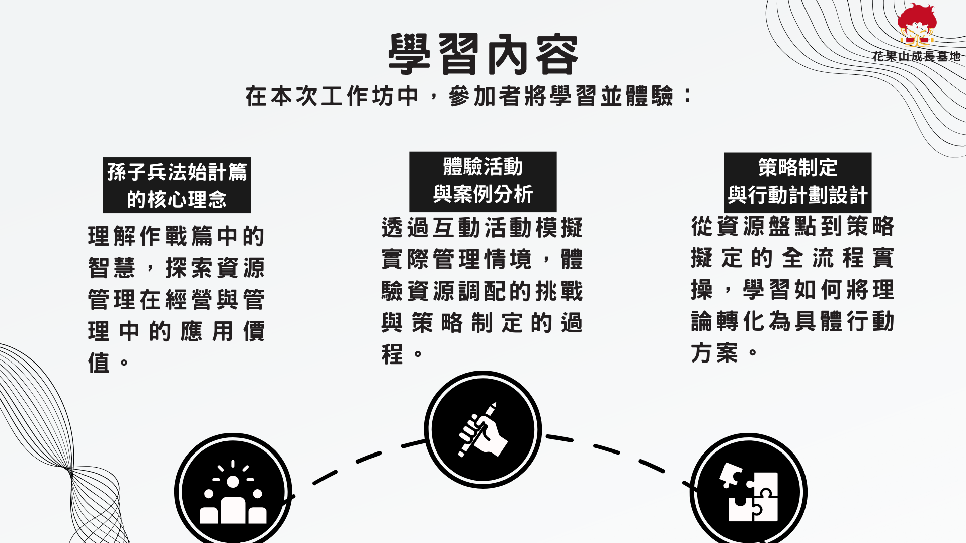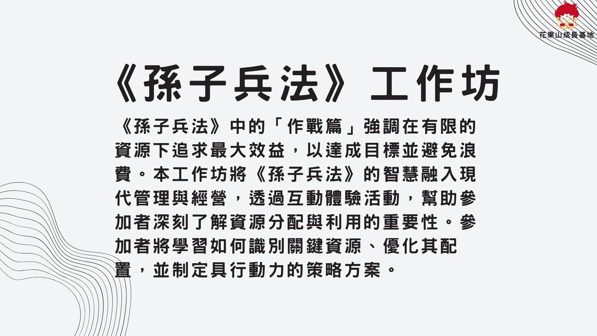 《孫子兵法》中的「作戰篇」強調在有限的資源下追求最大效益,以達成目標並避免浪費。本工作坊將聚焦於如何將《孫子兵法》的智慧融入現代管理與經營,透過互動體驗活動,幫助參加者深刻了解資源分配與利用的重要性。參加者將學習如何識別關鍵資源、優化其配置,並制定具行動力的策略方案。