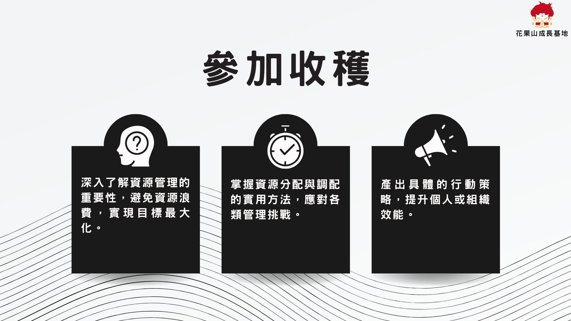 - 策略與行動設計:協助參加者將資源管理的概念轉化為實際行動方案,應用於工作或企業經營中。