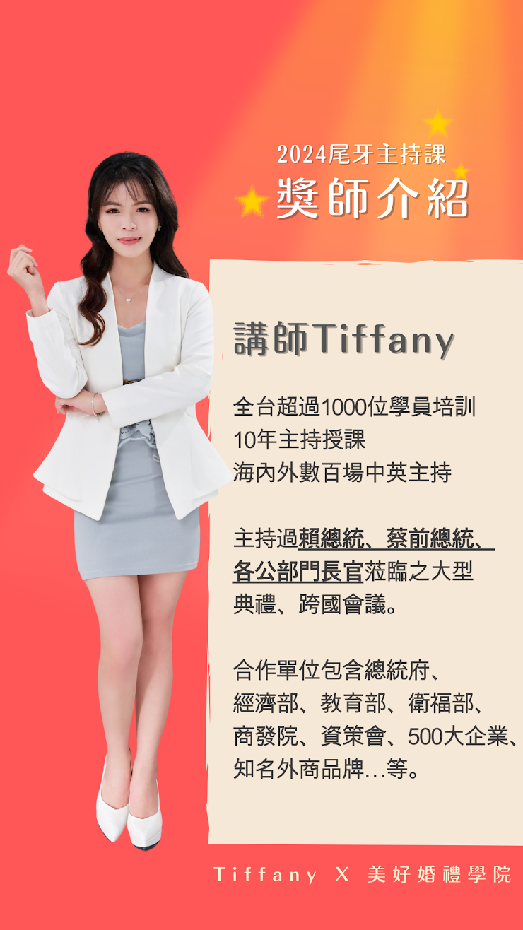 Tiffany 老師曾主持海內外數百場大型活動,全台培訓主持溝通學員破千人